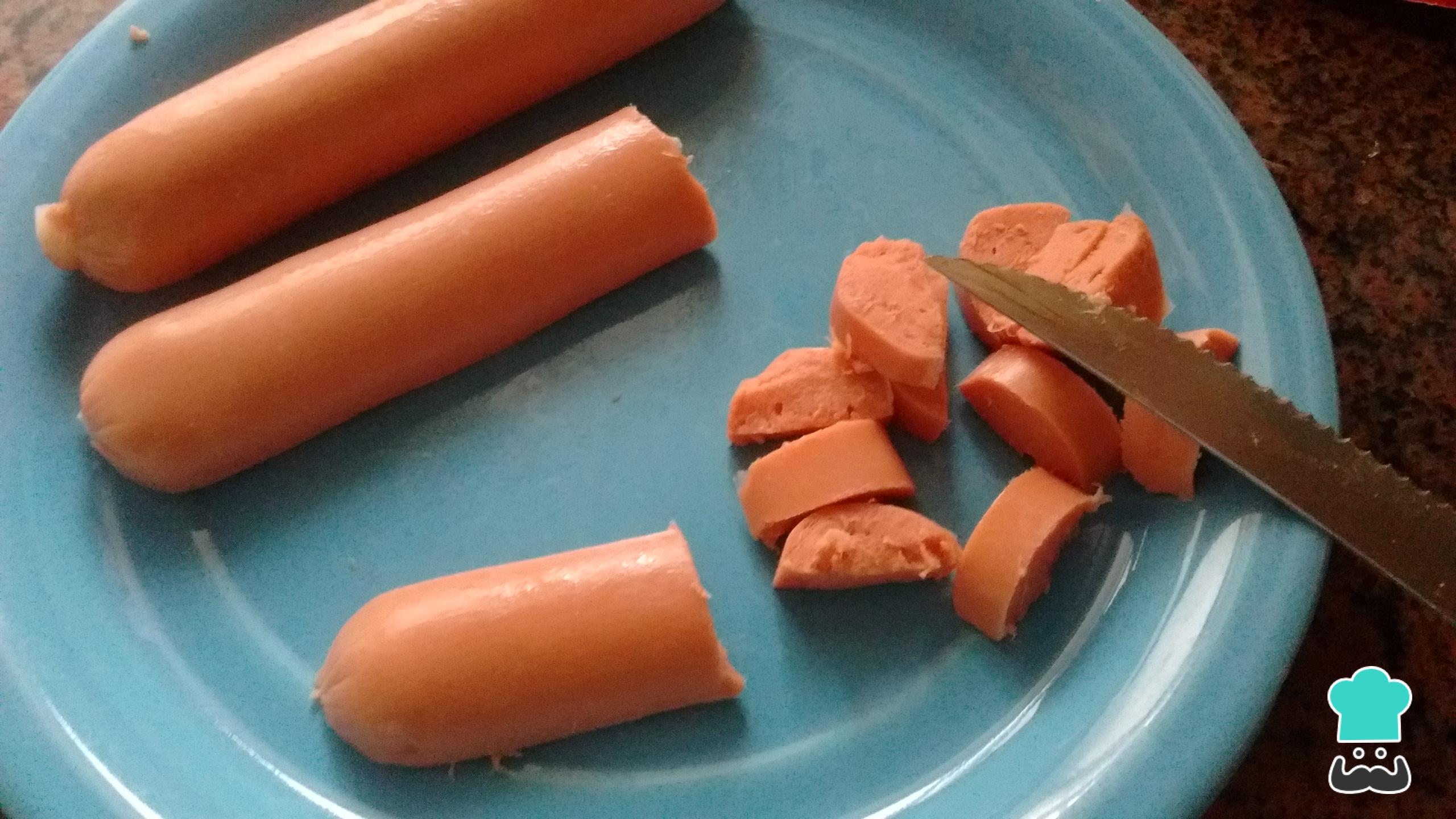 Por otro lado, corta las salchichas al medio y luego en medias rueditas. Recomendamos elijas alguna ahumada, tipo alemana, en lugar de las clásicas para pancho, sobre todo si las preparas para adultos.