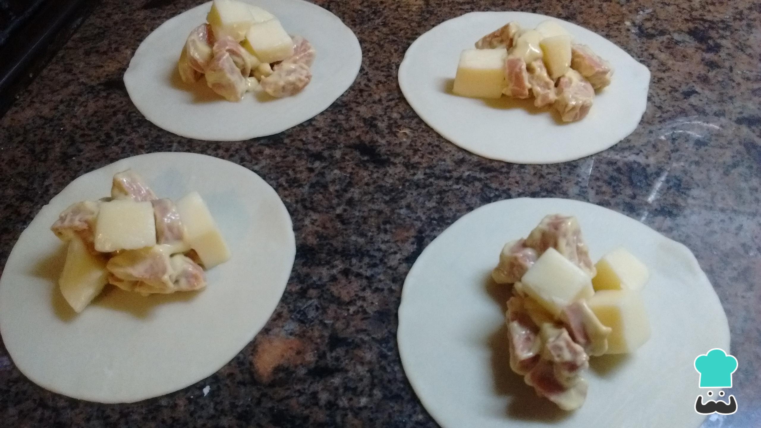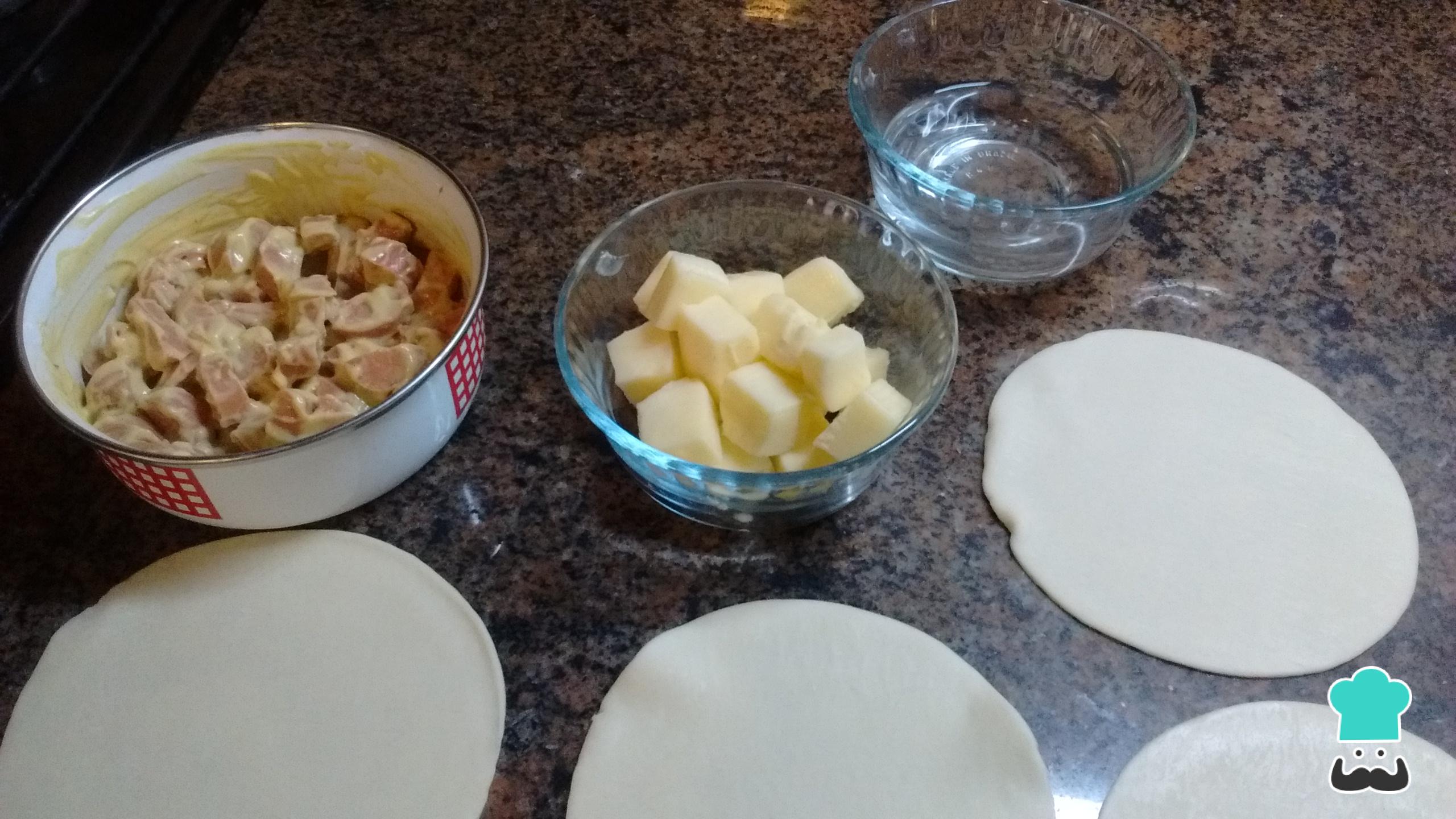 Agrega una cucharada de las salchichas con la salsa golf en el centro del disco y unos cubos de queso. Humedece la mitad del borde con el agua y cierra las empanadas.