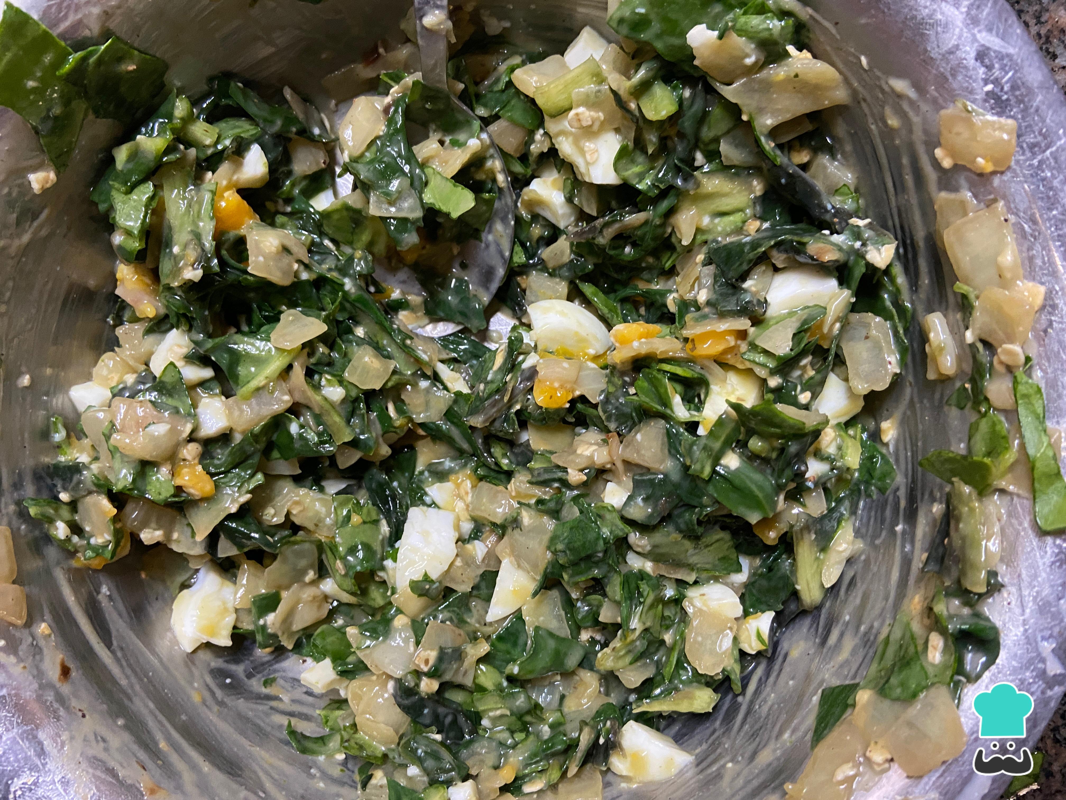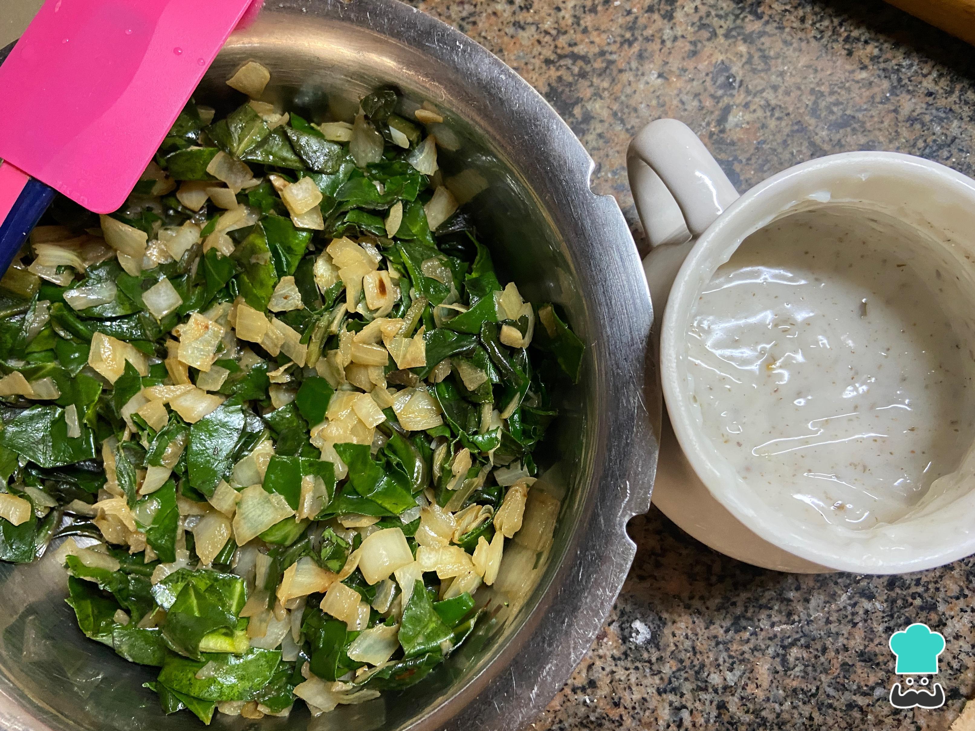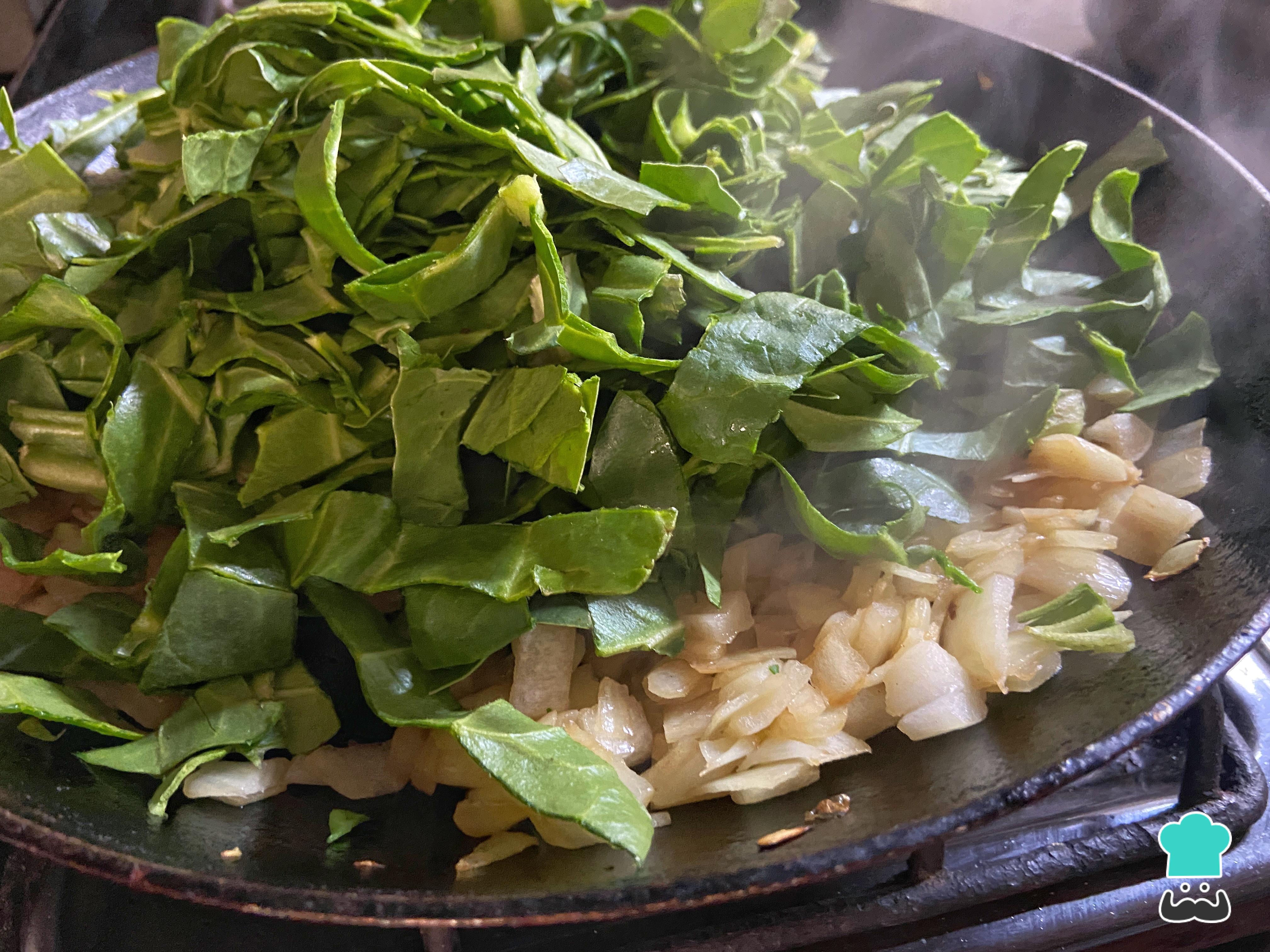 Cuando la cebolla esté cocida, sube el fuego al máximo y agrega las hojas de acelga limpias y picadas. A continuación, remueve y cocina por tan solo unos segundos, por el contrario, empezará a liberar mucho líquido. Retira del fuego y reserva para que se enfríe.