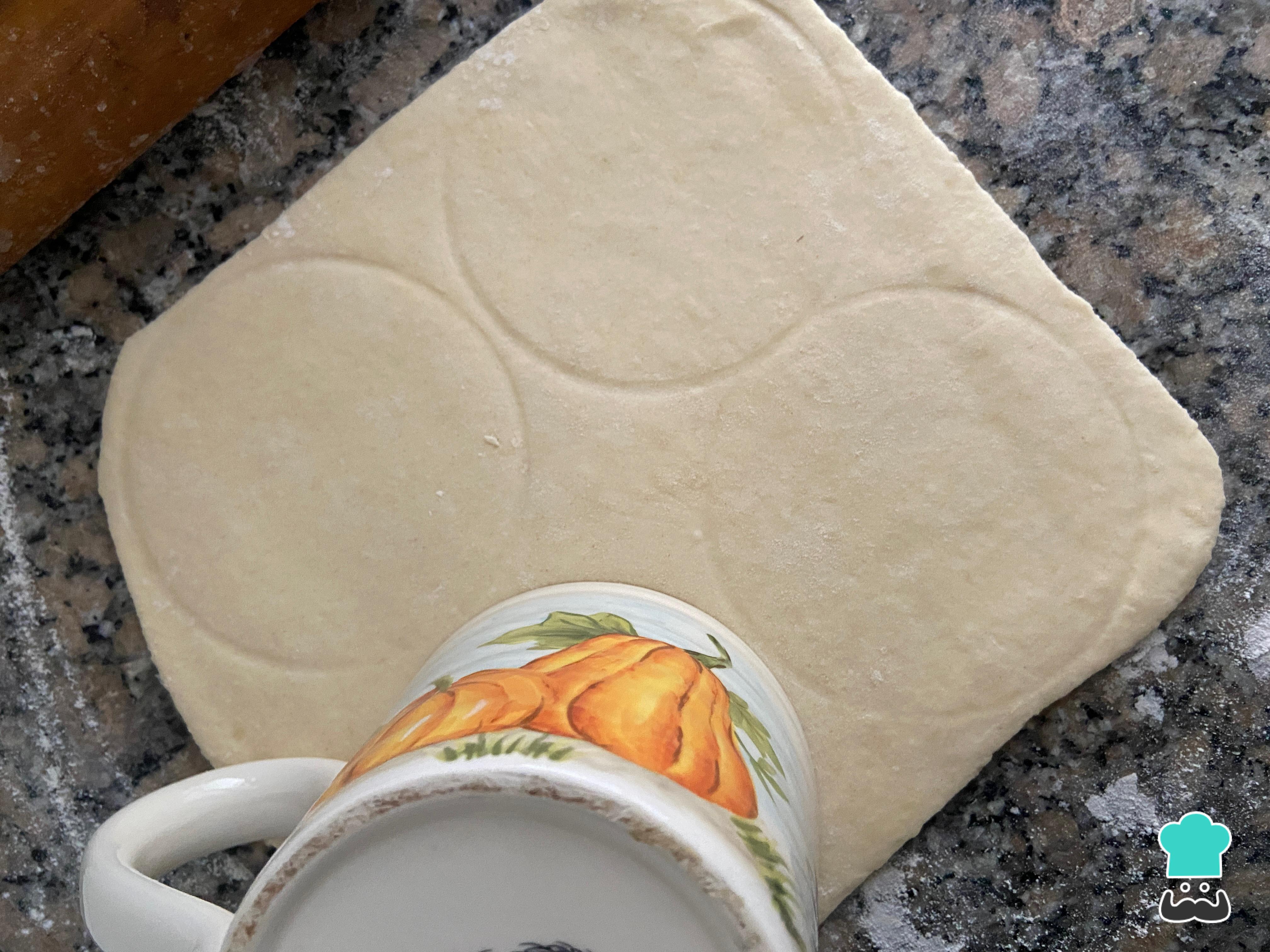 Corta las tapas de tus empanadas con ayuda de un cortante, taza o vaso de unos 12 centímetros de diámetro.
