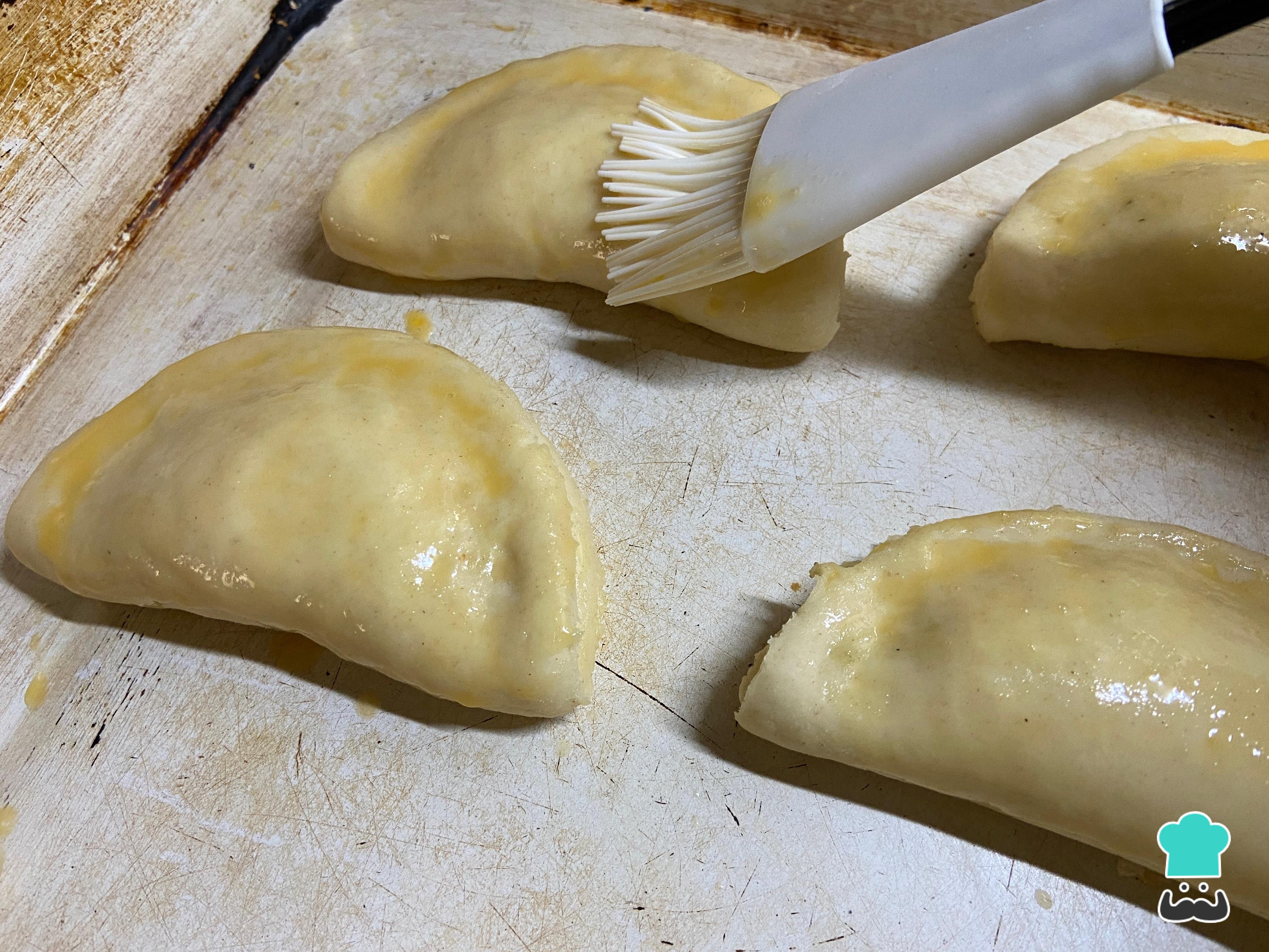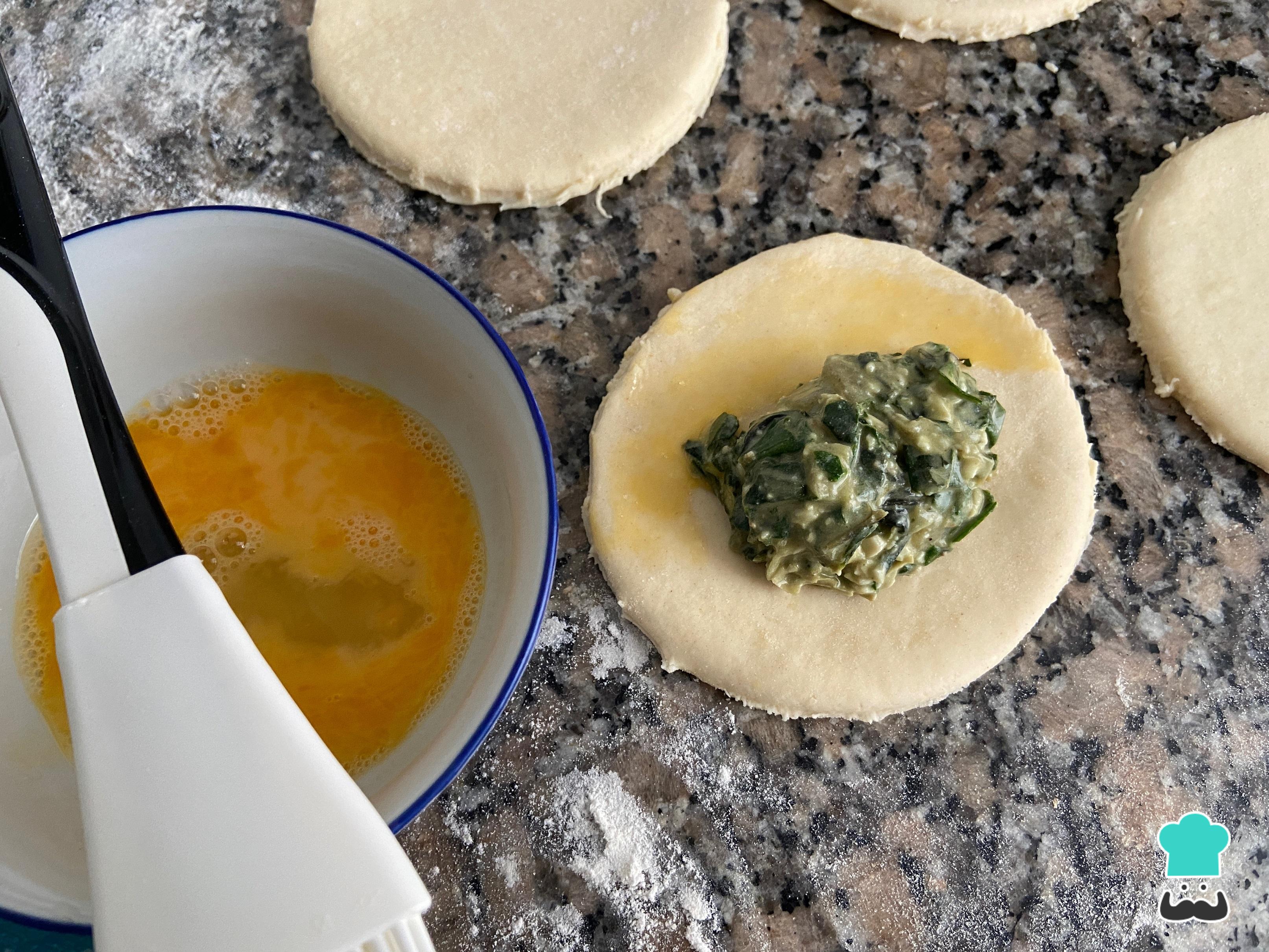 Agrega una cucharada de relleno en el centro y pinta la mitad del disco con huevo batido.