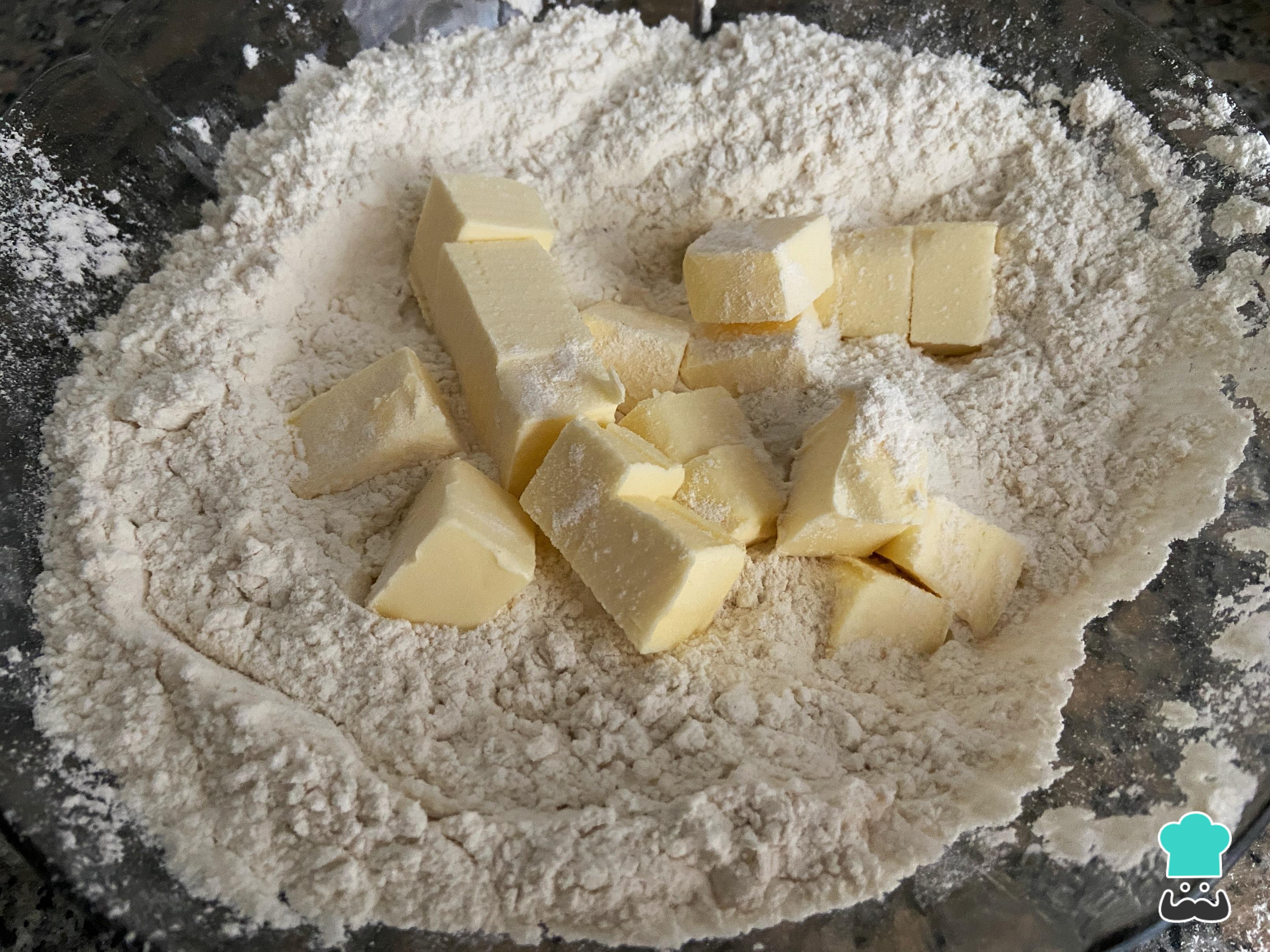A continuación, haz un hueco en el centro para agregar la manteca fría cortada en cubos. Con ayuda de las manos, integra ambos ingredientes con las yemas de los dedos buscando formar arenilla.