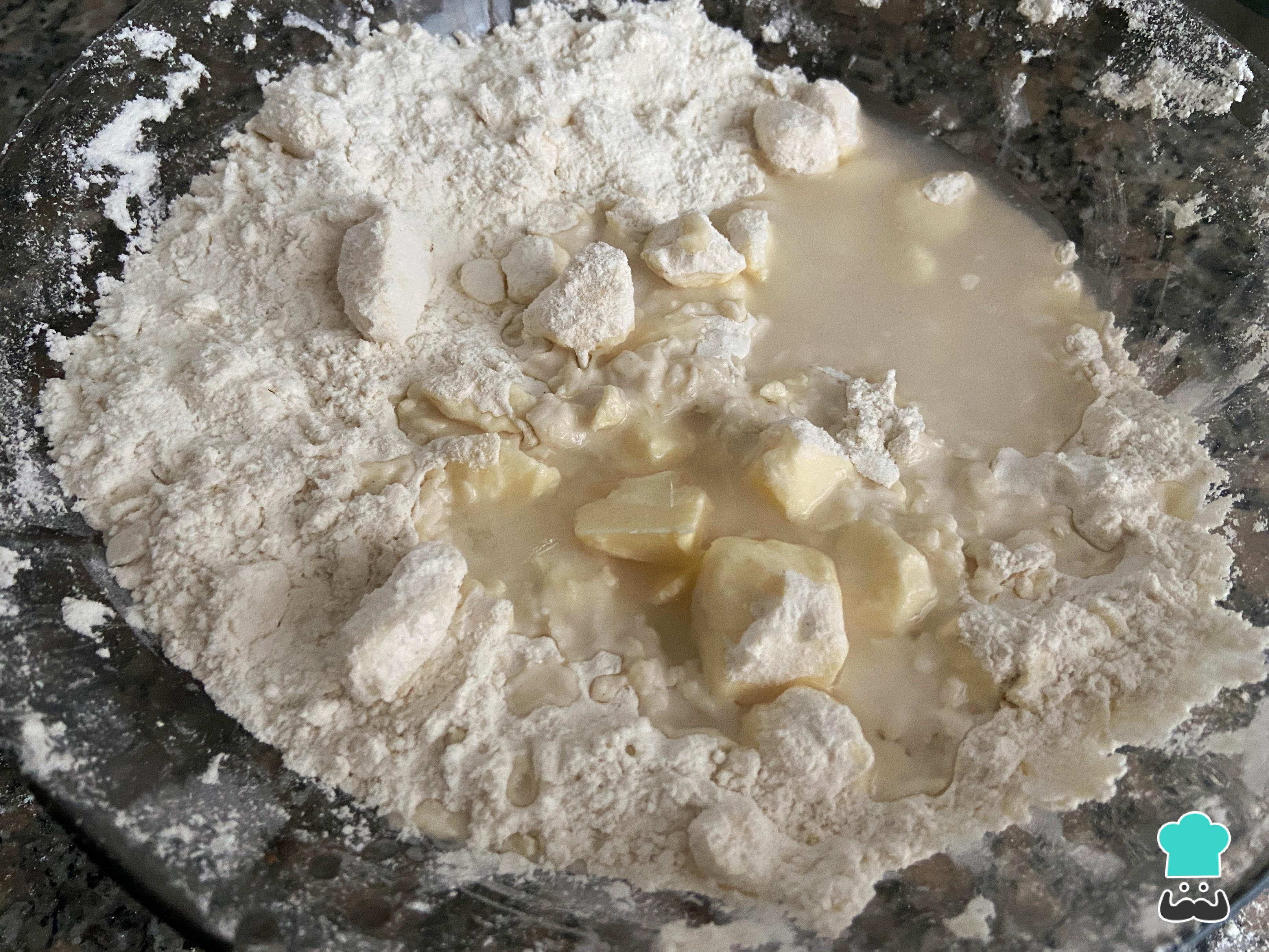 Poco a poco, añade las cucharadas de agua fría. A continuación, integra con ayuda de un cornet o cuchara para no transferir demasiado calor con la mano, tampoco debes amasar demasiado. Por el contrario, se formará el hojaldre.