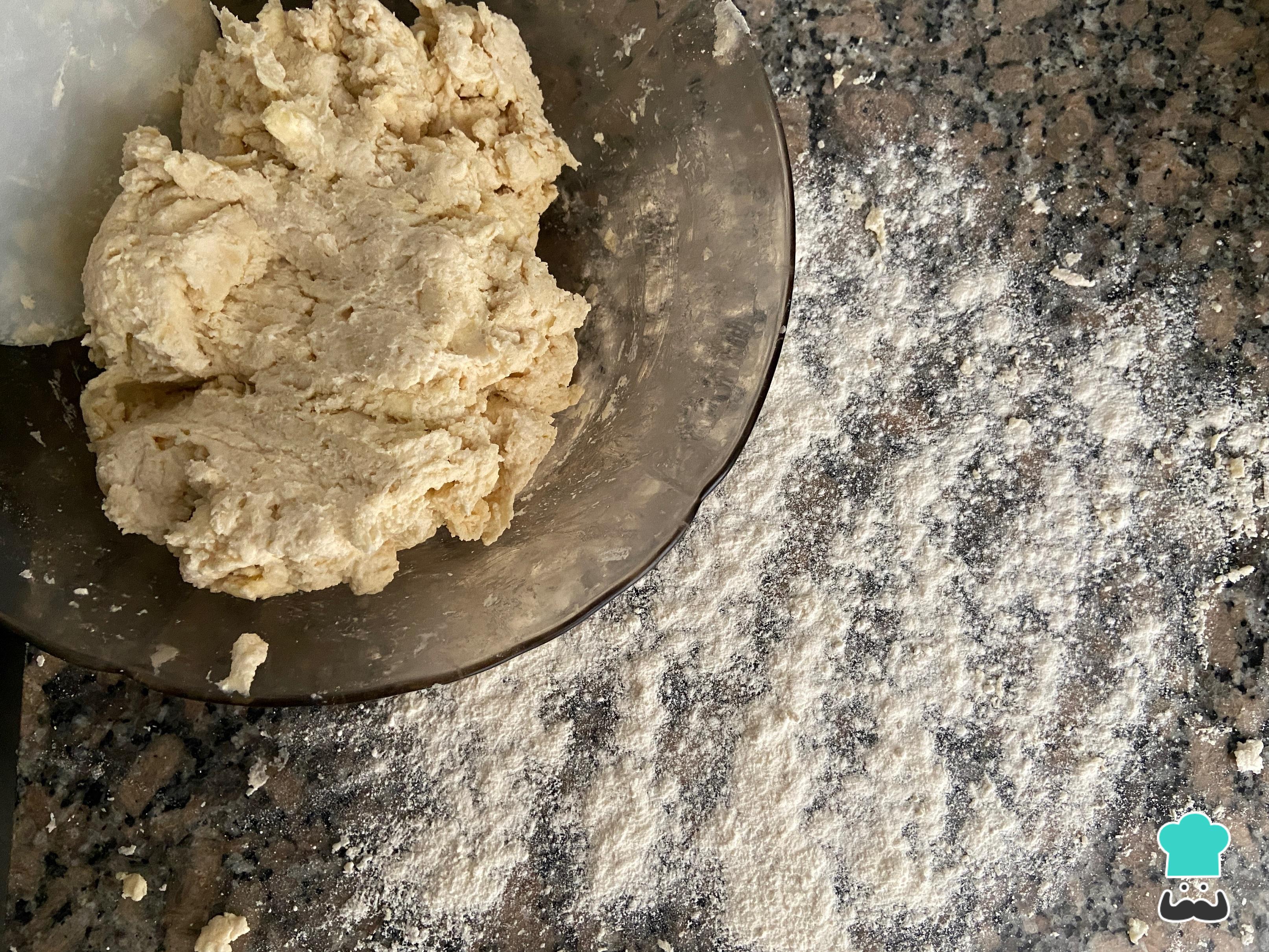 Cuando hayas formado un bollo, sin importar que esté demasiado unido, llévalo a la mesada limpia y enharinada.