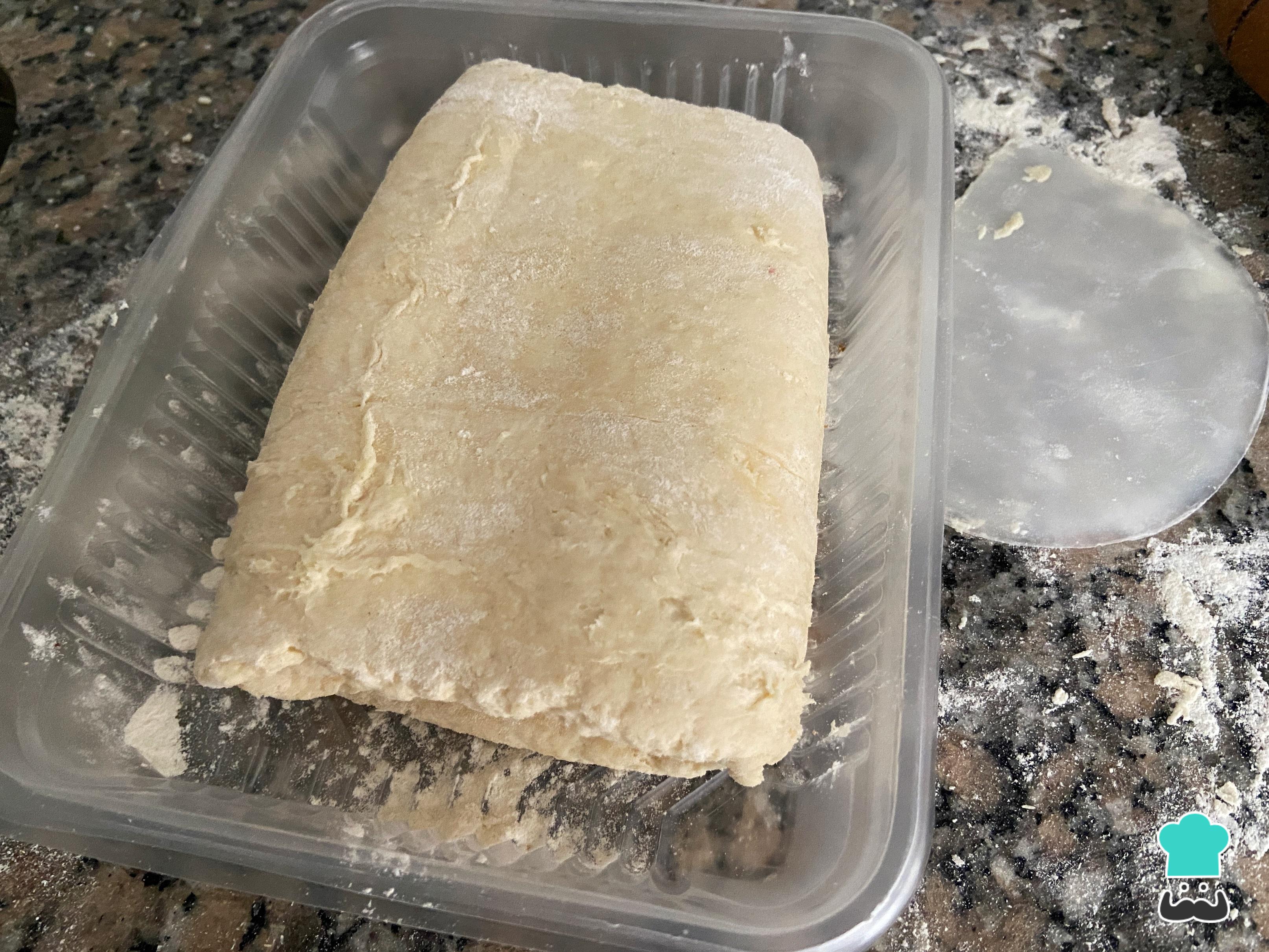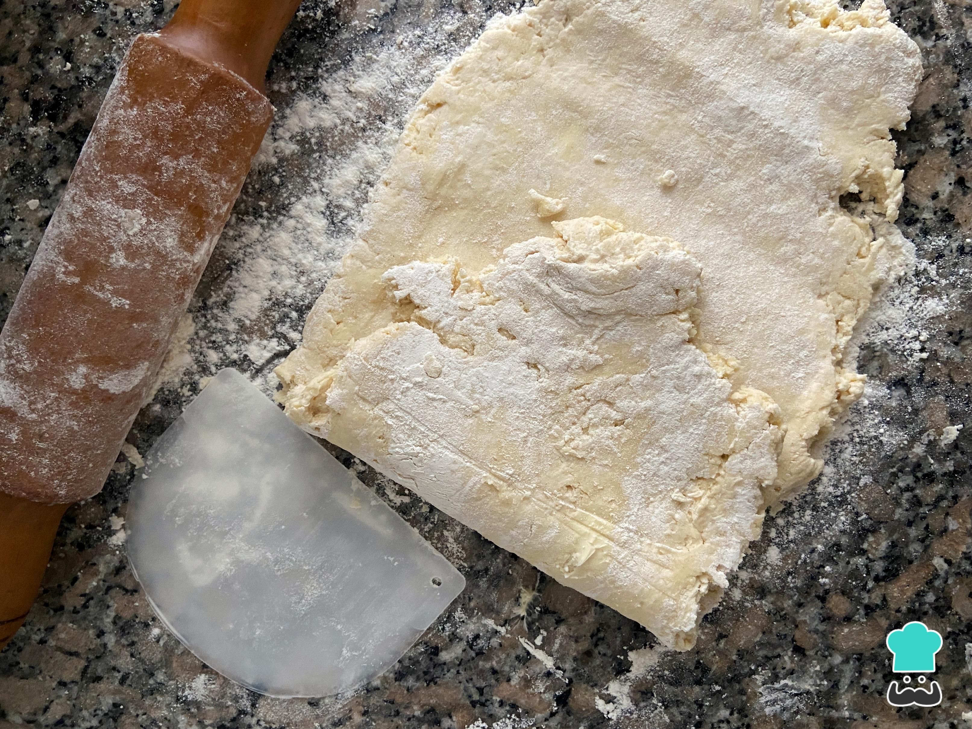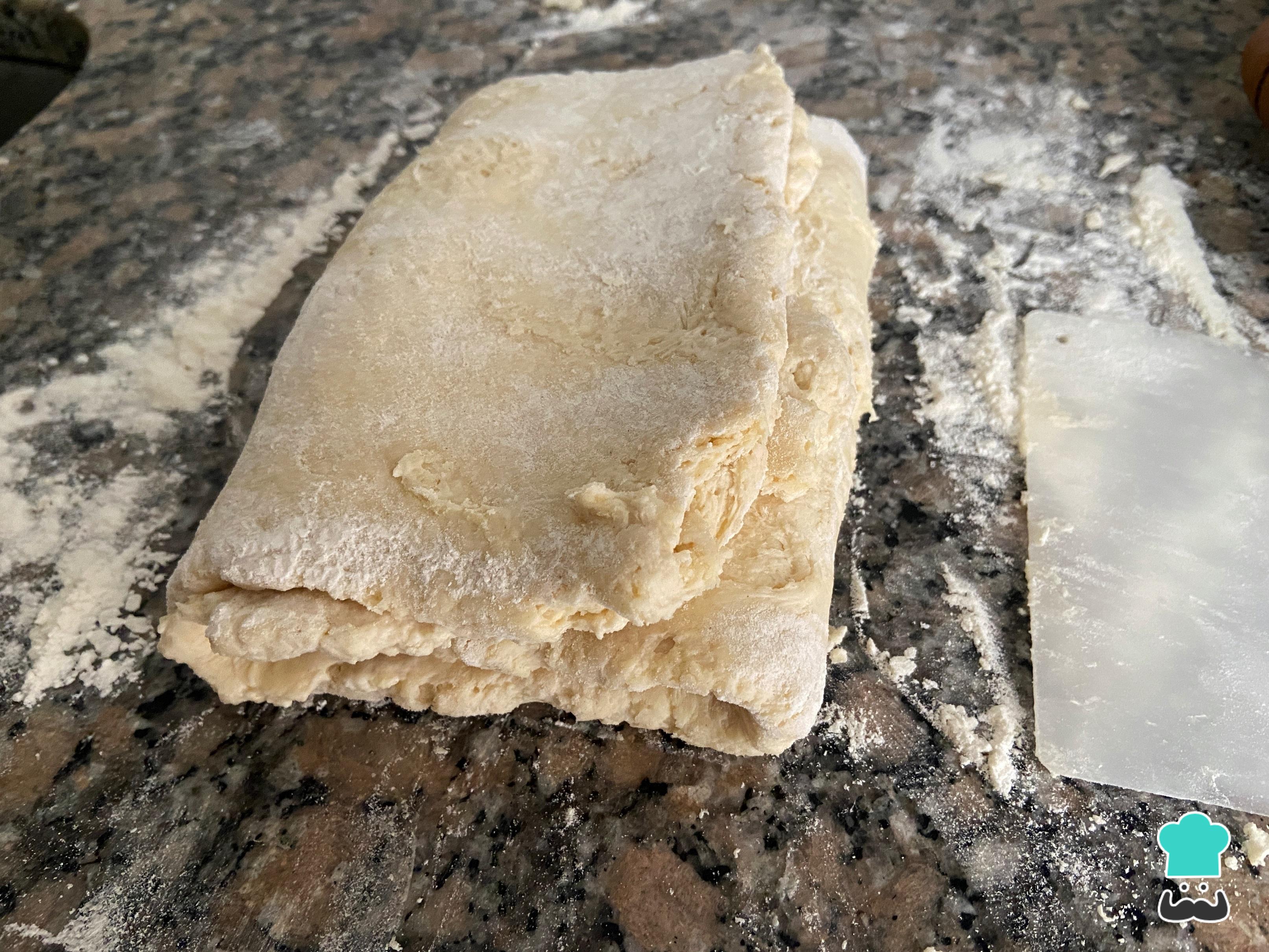 Dóblala en 3 nuevamente y llévala al frío durante 15 o 20 minutos. Estira verticalmente, dobla y refrigera 2 veces más.