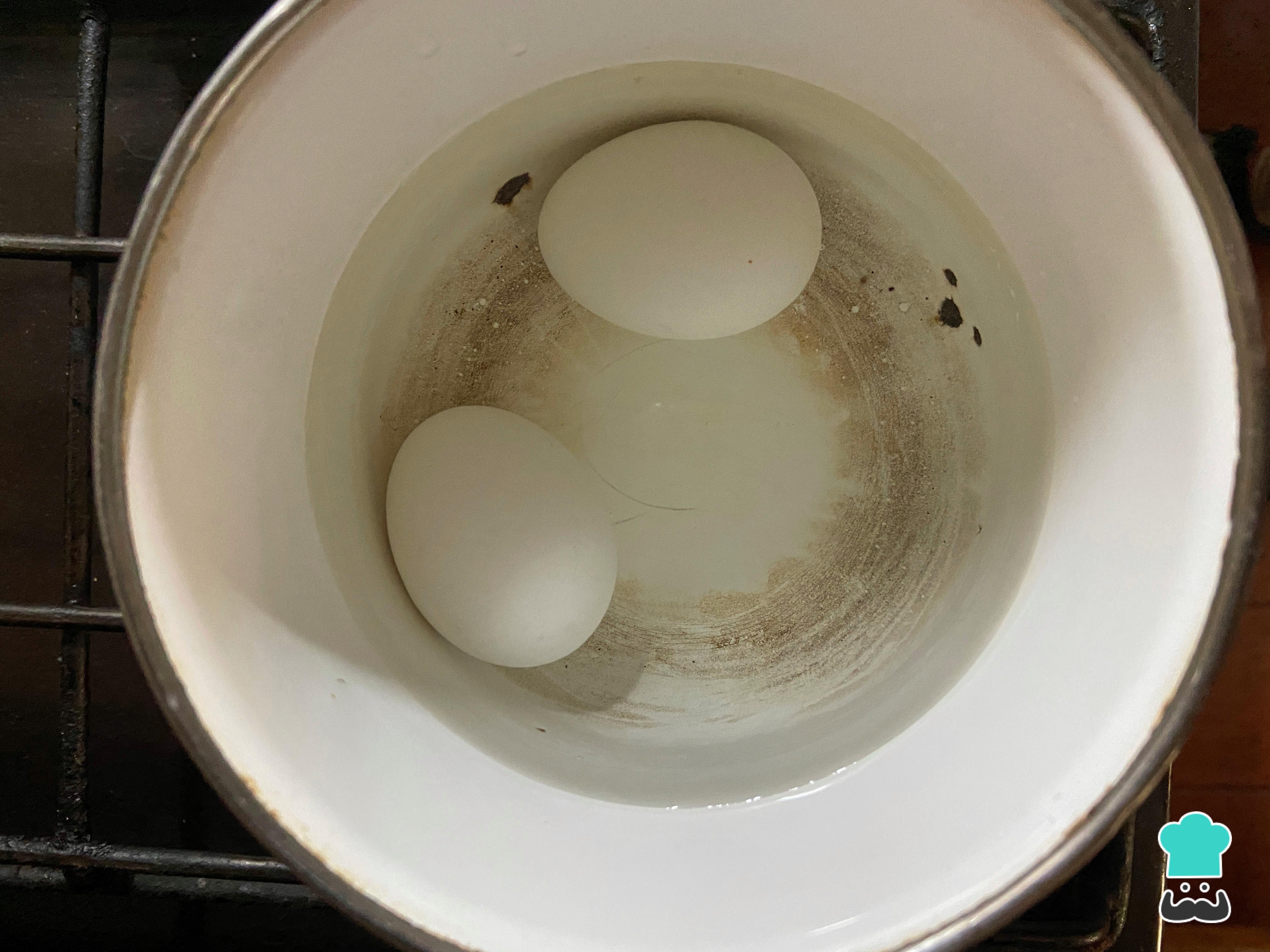 Mientras, comienza con la preparación del relleno de tus empanadas de vigilia. Por un lado,primero cocina en agua fría los huevos 12 minutos.