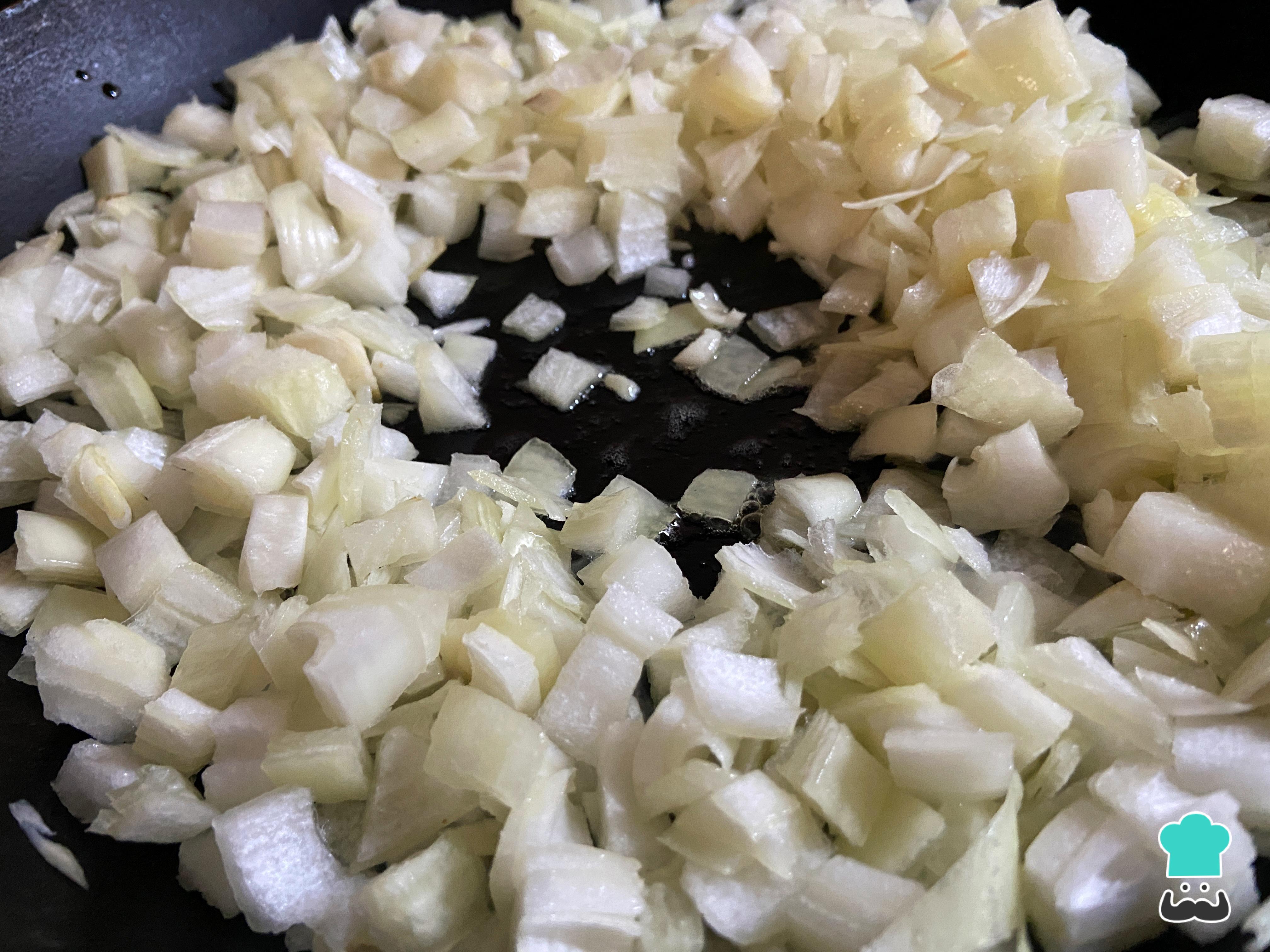 Por otro lado, pela y corta la cebolla en cubos pequeños. A continuación, saltéala en una sartén con 1 cucharadita de aceite a fuego máximo. Cuando esté transparente, baja el fuego al medio y remueve cada tanto para que no se pegue. Si empieza a pegarse, puedes agregar 1 cucharada de agua para evitarlo.