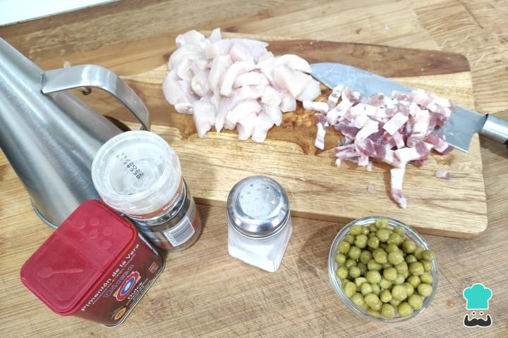 Trocea la pechuga a cubos no demasiado grandes, y la panceta a tiras si no viene cortada aún.