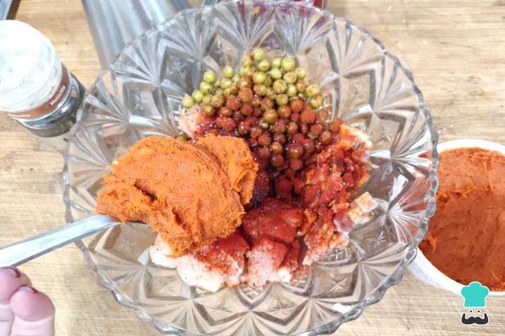 Vierte en un recipiente los guisantes, la panceta, la pechuga y la cucharada colmada de sobrasada. Salpimienta y, por último, añade un chorro de aceite. Remueve con suavidad para evitar aplastar los guisantes.