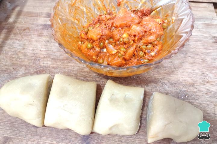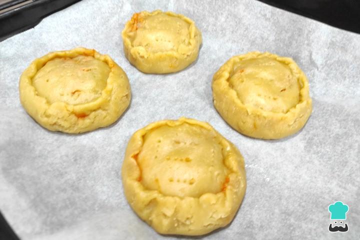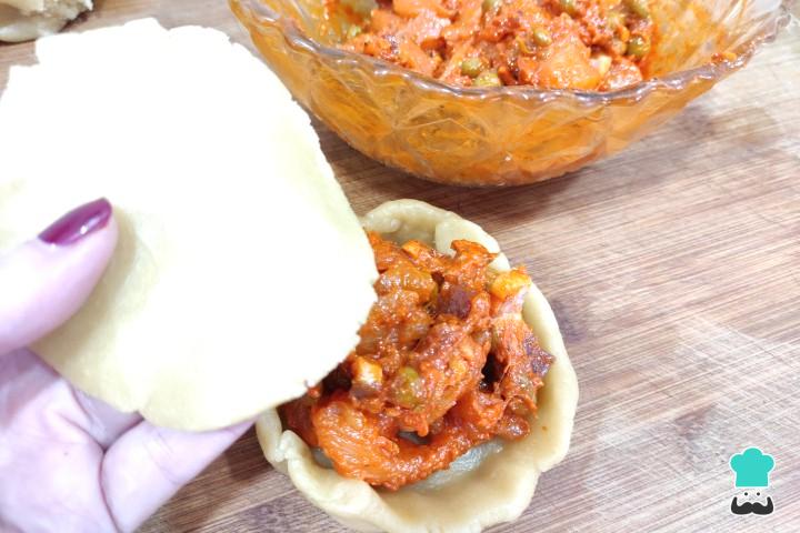 Haz una bola y aplasta con las manos. Si notas que se te adhiere a las manos, úntalas un poco con aceite. Dale forma redonda y rellena con una cucharada del relleno mezclado. Levanta hacia arriba los bordes y deposita encima la pieza más pequeña de masa. Une los bordes de ambas piezas para que quede totalmente cerrada y dale una forma en zigzag o trenzada.