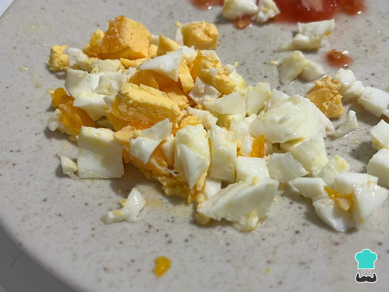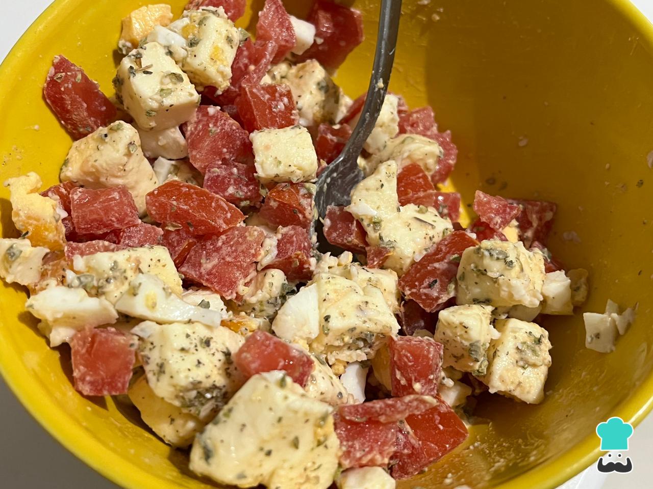 Mezcla el tomate con el queso en cubos, el huevo duro picado y provenzal u orégano seco.
