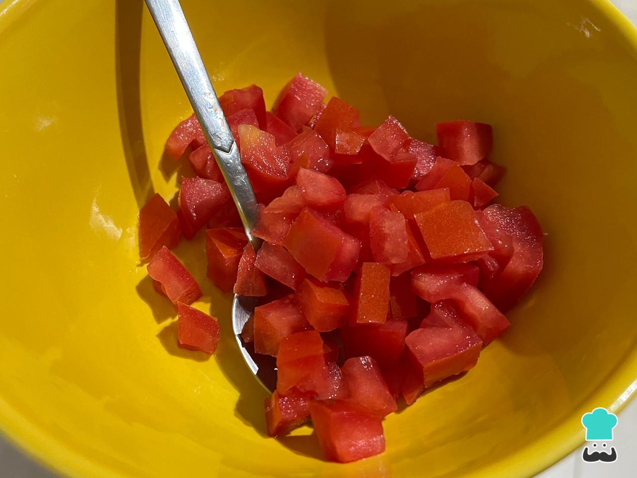 Lava bien la piel del tomate y pícalo en cubos, retirando el centro y sus semillas. Si no toleras la piel del tomate, entonces podrás pelarlo fácilmente con esta técnica: haz un corte en forma de cruz en la base. Pincha el tomate con un tenedor desde el cabo y sumérgelo en agua hirviendo unos segundos. Déjalo enfriar y retira sencillamente la piel. Luego, córtalo y sigue los pasos de la receta.