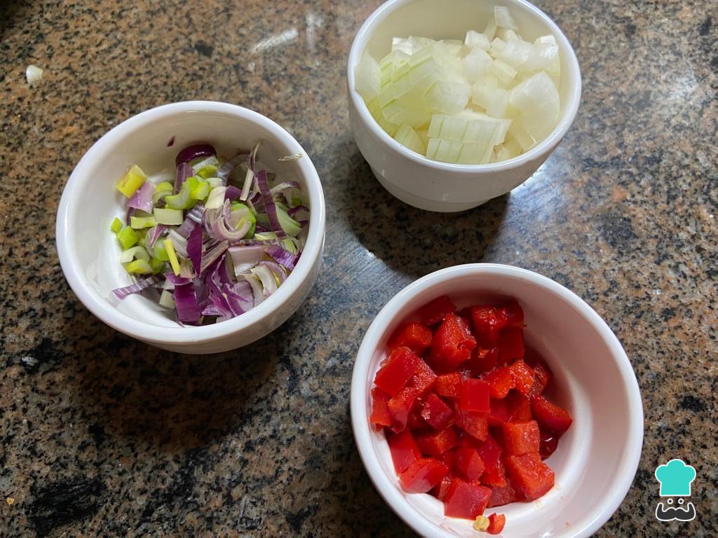 Pela y pica el ajo y la cebolla. También lava y pica el pimiento y, por último, lava y pica el bulbo de la cebolla de verdeo. Reserva las hojas verdes para agregar en el último momento crudas.