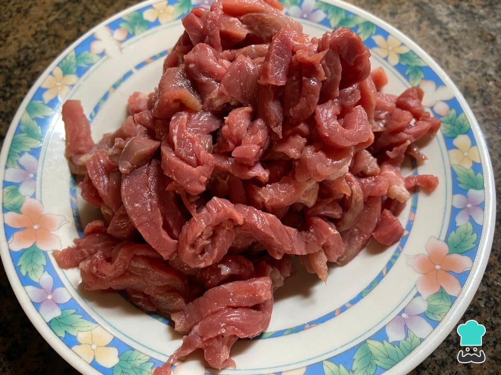 Posteriormente, corta los bifecitos de carne en tiritas o cubos pequeños.