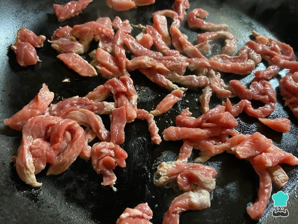 A continuación, pon a calentar una olla o sartén con una cucharada de grasa de pella. Cuando se derrita y tome temperatura, saltea allí la carne. Te recomendamos ir haciéndolo por tandas para que la carne no desprenda todo su jugo y quede hervida.
