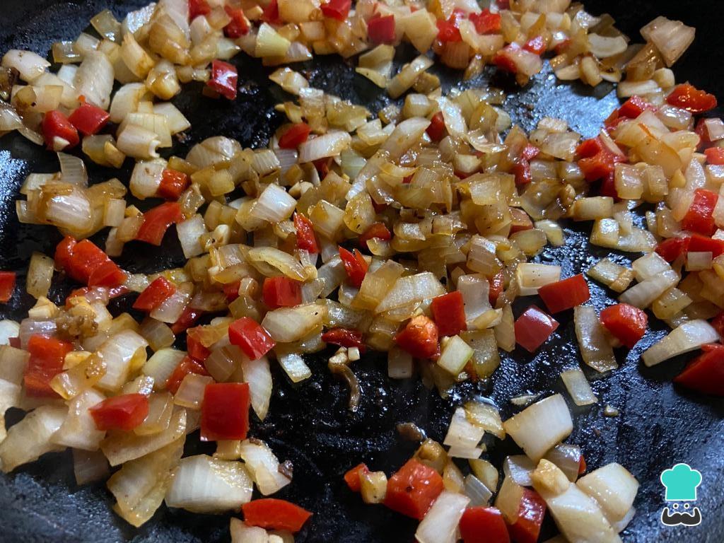 Cuando hayas terminado con la carne, resérvala en otro recipiente y coloca la otra cucharada de grasa en la sartén. Saltea allí el ajo, la cebolla y el pimiento.