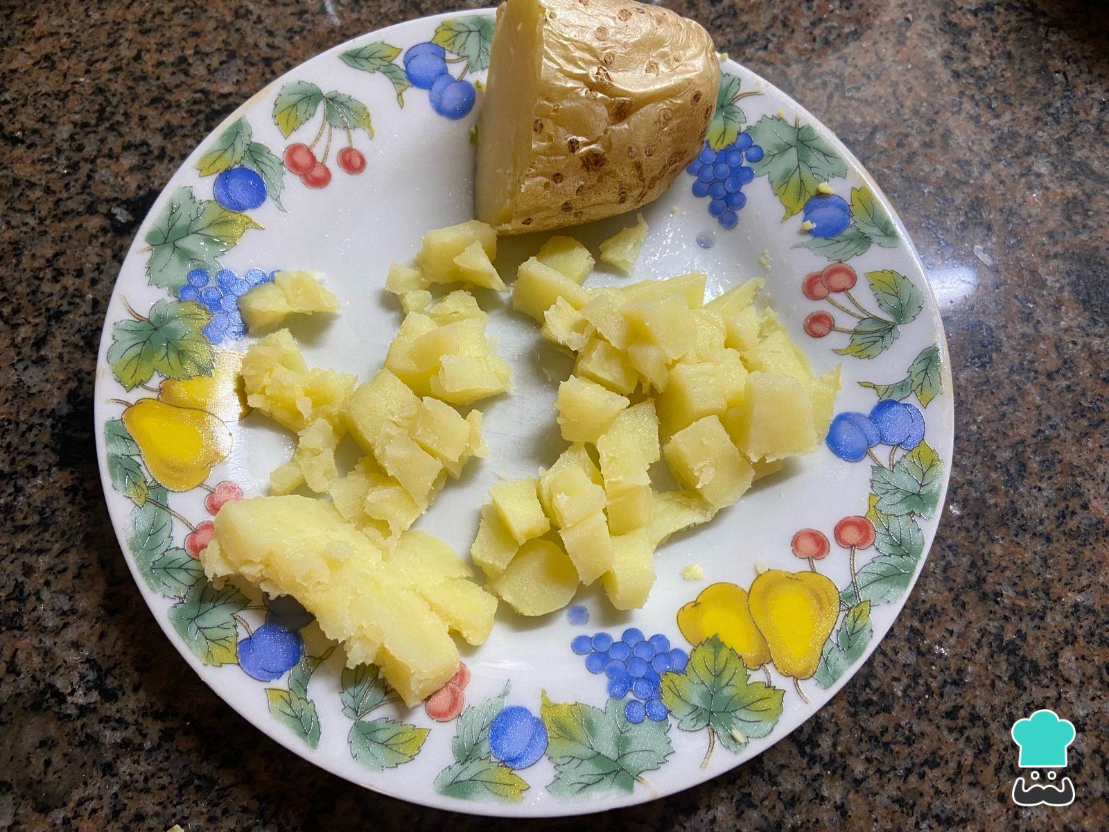 Mientras tanto, cocina la papa. Lávala bien y hiérvela con la cáscara para que no absorba tanta agua. Cuando esté cocida, deja enfriar, retira la piel y corta en cubos pequeños.