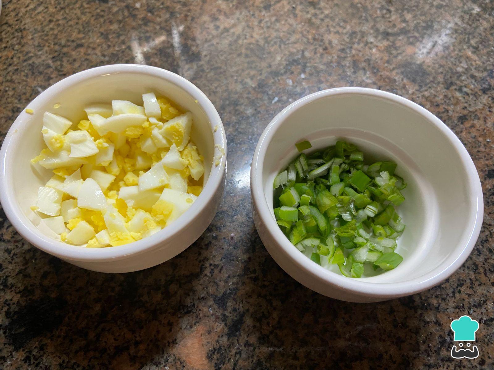 A continuación, pica el huevo duro y las hojas de la cebolla de verdeo.