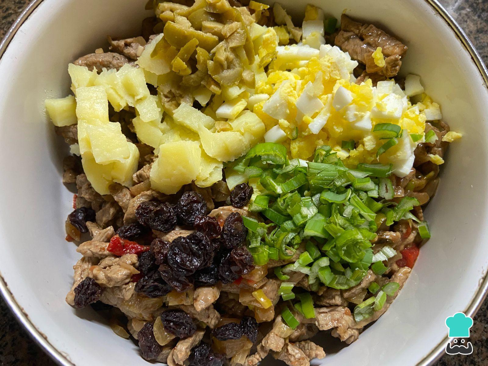 Incorpora al relleno la papa, el huevo duro, las hojas de verdeo, las aceitunas y las pasas de uva. Revuelve bien para que todo quede integrado de forma homogénea.