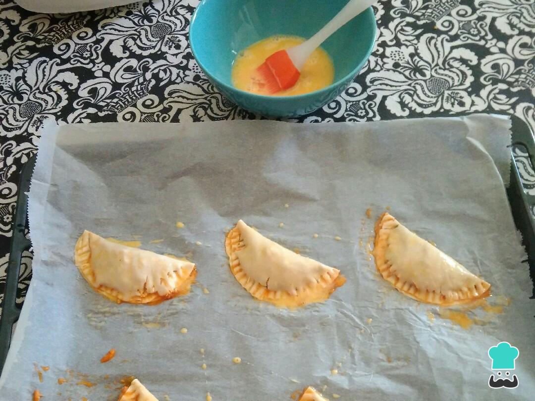 Dejar que las empanadillas de atún, cebolla y pimiento se horneen unos 15 minutos a 180 °C.