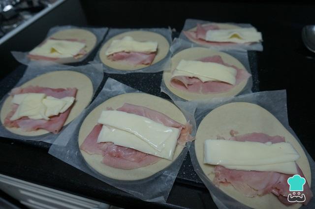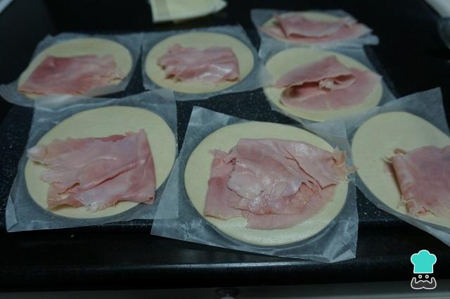 Estas empanadillas caseras las haremos con obleas ya lista para empanadas, entonces empezaremos por separarlas una a una y colocar encima las lonchas de jamón york.
