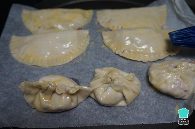 Sellamos los bordes con ayuda de un tenedor y las pintamos con huevo batido por encima para que queden brillantes.