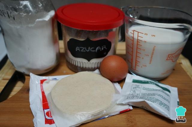 Preparamos los ingredientes para poder empezar a elaborar las empanadillas dulces de flan. Nosotros hemos comprado las obleas ya hechas, pero también se puede hacer la masa de empandas casera y cortar círculos iguales.
