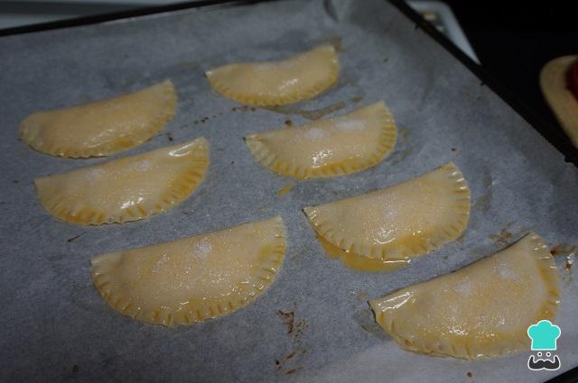 Las ponemos en una bandeja para horno, batimos el huevo y pintamos las empanadillas de flan. Podemos poner un poco de azúcar en cada empanadilla.