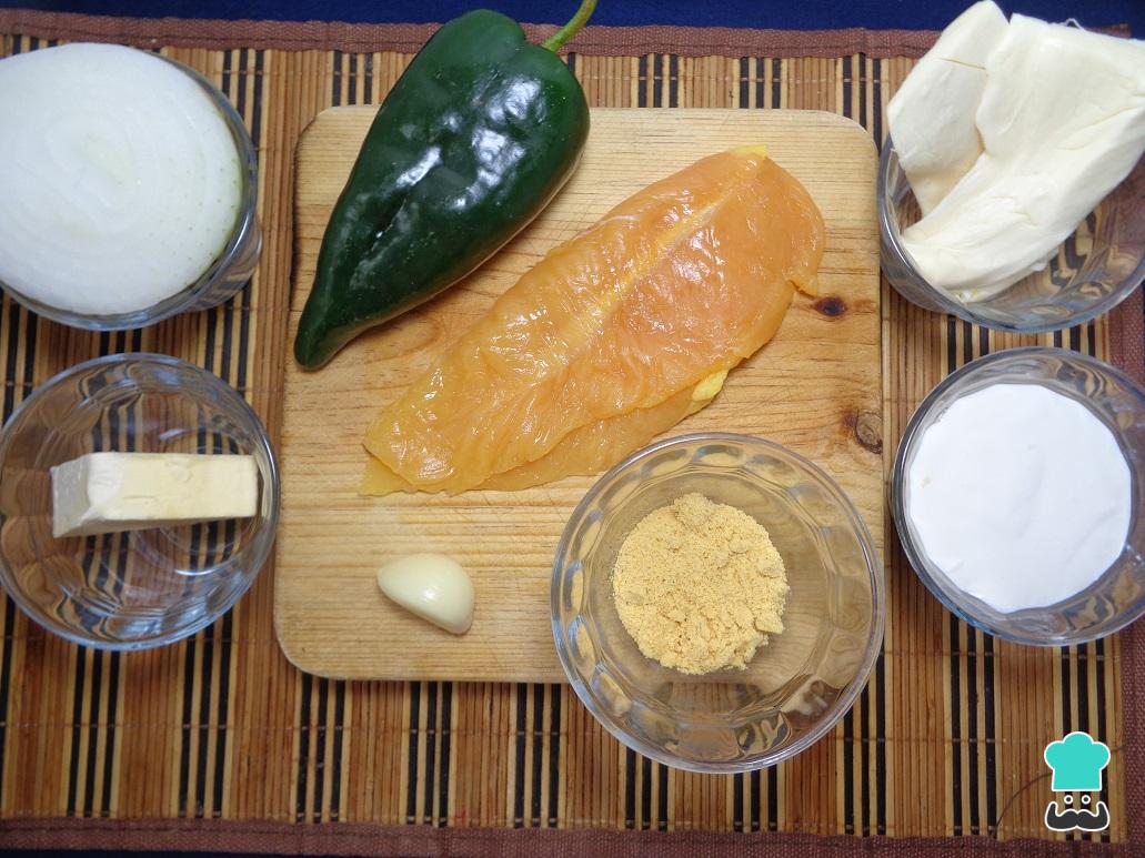 Para la preparación de estas enchiladas de pollo con chile poblano necesitaremos reunir todos los ingredientes primero.
