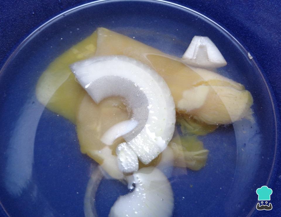 Vamos a comenzar poniendo a cocinar la pechuga de pollo en una cacerola con suficiente agua hirviendo, añadiendo un trozo de cebolla y una pizca de sal, y dejamos que se cueza a fuego alto.