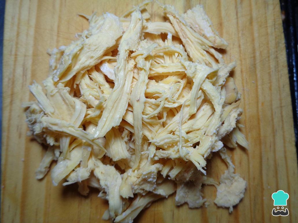 Una vez cocido el pollo lo deshebramos completamente y lo reservamos un momento.