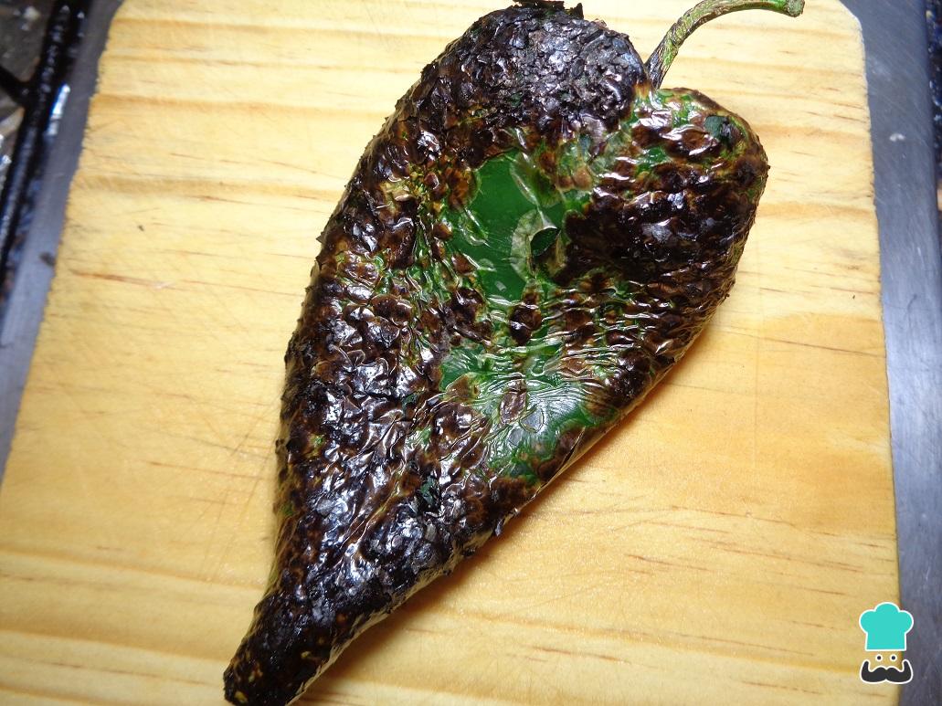 Por otro lado, ponemos a asar el chile poblano, y una vez se observe quemadito por toda su superficie, bajo el chorro del agua comenzamos a quitarle toda esta piel y a limpiarlo perfectamente, desvenándolo y quitándole las semillas.