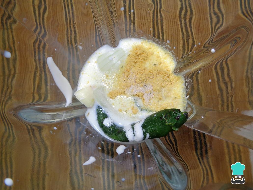 Una vez listos nuestros chiles poblanos, los colocamos en la licuadora junto con la crema ácida, la leche, la cebolla, el ajo, el consomé de pollo en polvo, una pizca de sal y pimienta, y licuamos todo hasta obtener una salsa homogénea para las enchiladas de pollo caseras.