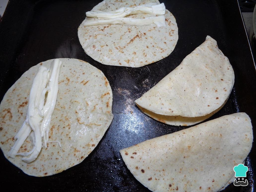Ahora a nuestras tortillas de maíz les colocamos en su superficie un poco de aceite y dejamos que se doren ligeramente, rellenamos con el queso de hebra y doblamos las tortilla, así como se observa en la siguiente imagen.