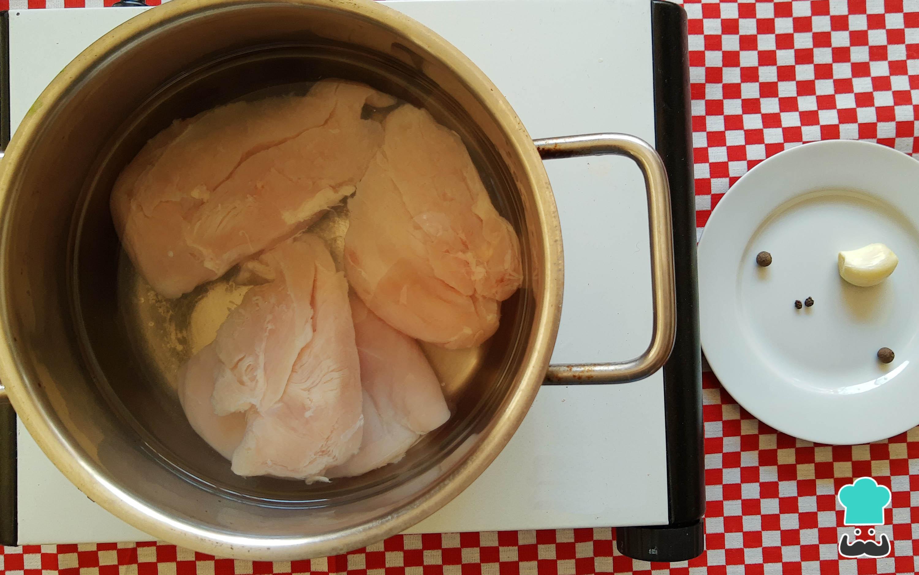 Para preparar las enchiladas suizas rojas, primero cocina el pollo en suficiente agua y agregando las pimientas, el diente de ajo y sal a tu gusto. Una vez listo, deshebra y reserva.