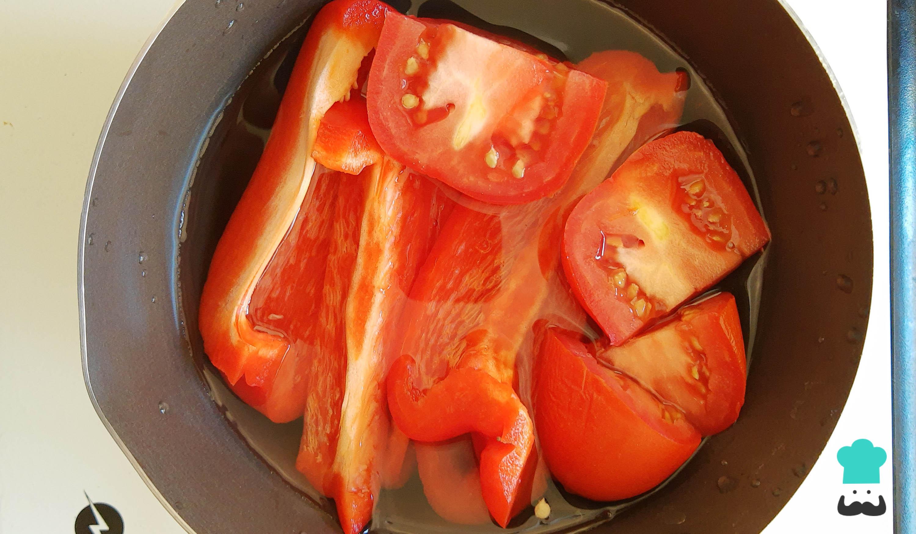 Mientras se cocina el pollo, lava y pica el chile morrón rojo, corta el jitomate y cocina ambos ingredientes en una olla con una taza y media de agua durante 10 minutos.