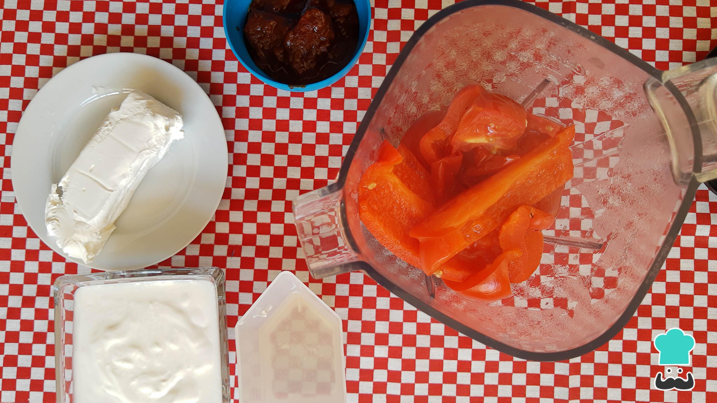 Cuando ya estén listos el chile morrón y el jitomate, agrégalos a la licuadora con la media barra de queso crema, la media crema, el caldo de pollo, un poco de sal y, de manera opcional, el chile chipotle. Licua muy bien y reserva.
