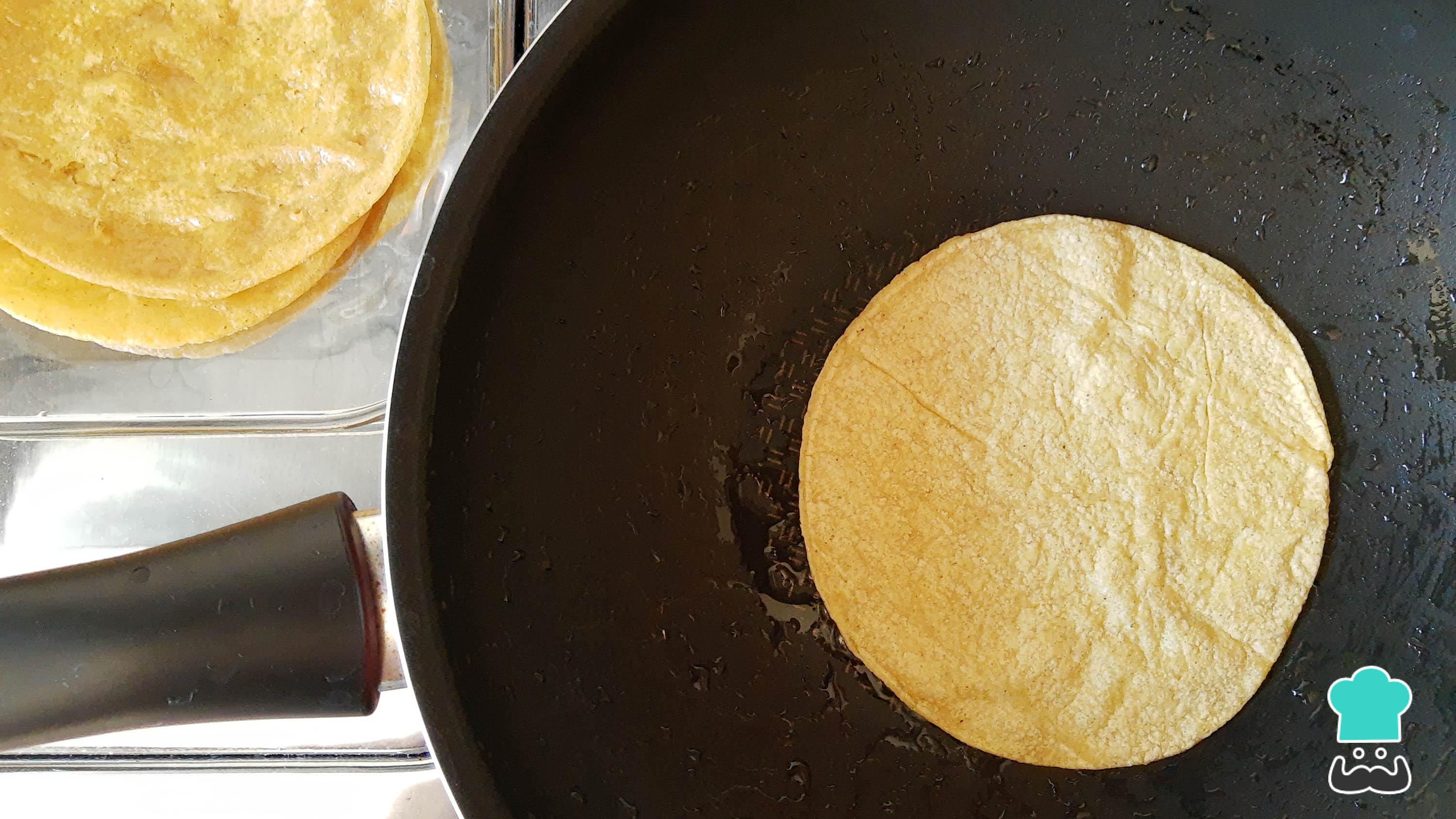 En una sartén caliente, dora un poco las tortillas, lo suficiente como para que se ablanden un poco y no se rompan. Puedes hacer tus propias tortillas para elaborar las enchilada suizas rojas siguiendo esta receta: "Tortillas de maíz mexicanas".