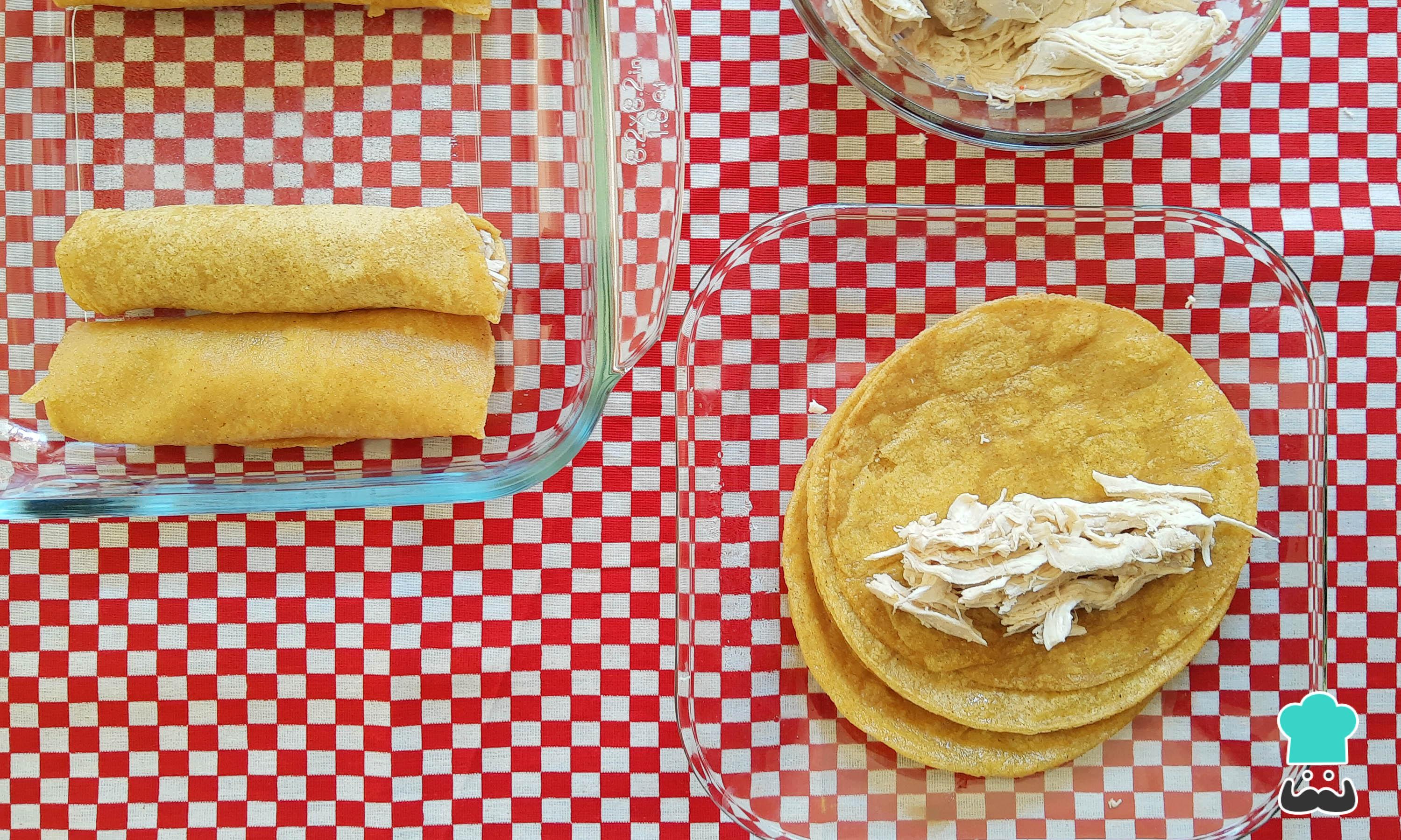 Rellena las tortillas con el pollo y enróllalas. Puedes acomodarlas en un refractario para horno o comenzar a emplatar.