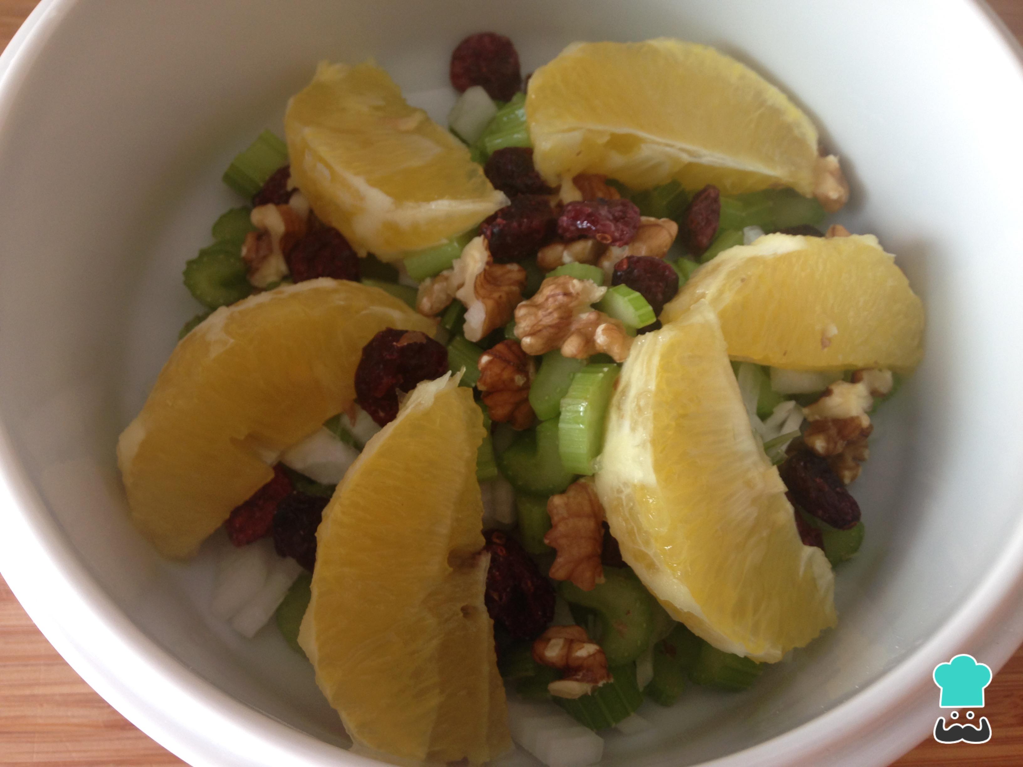 Añadimos las nueces y los arándanos a nuestra ensalada de apio y naranja.