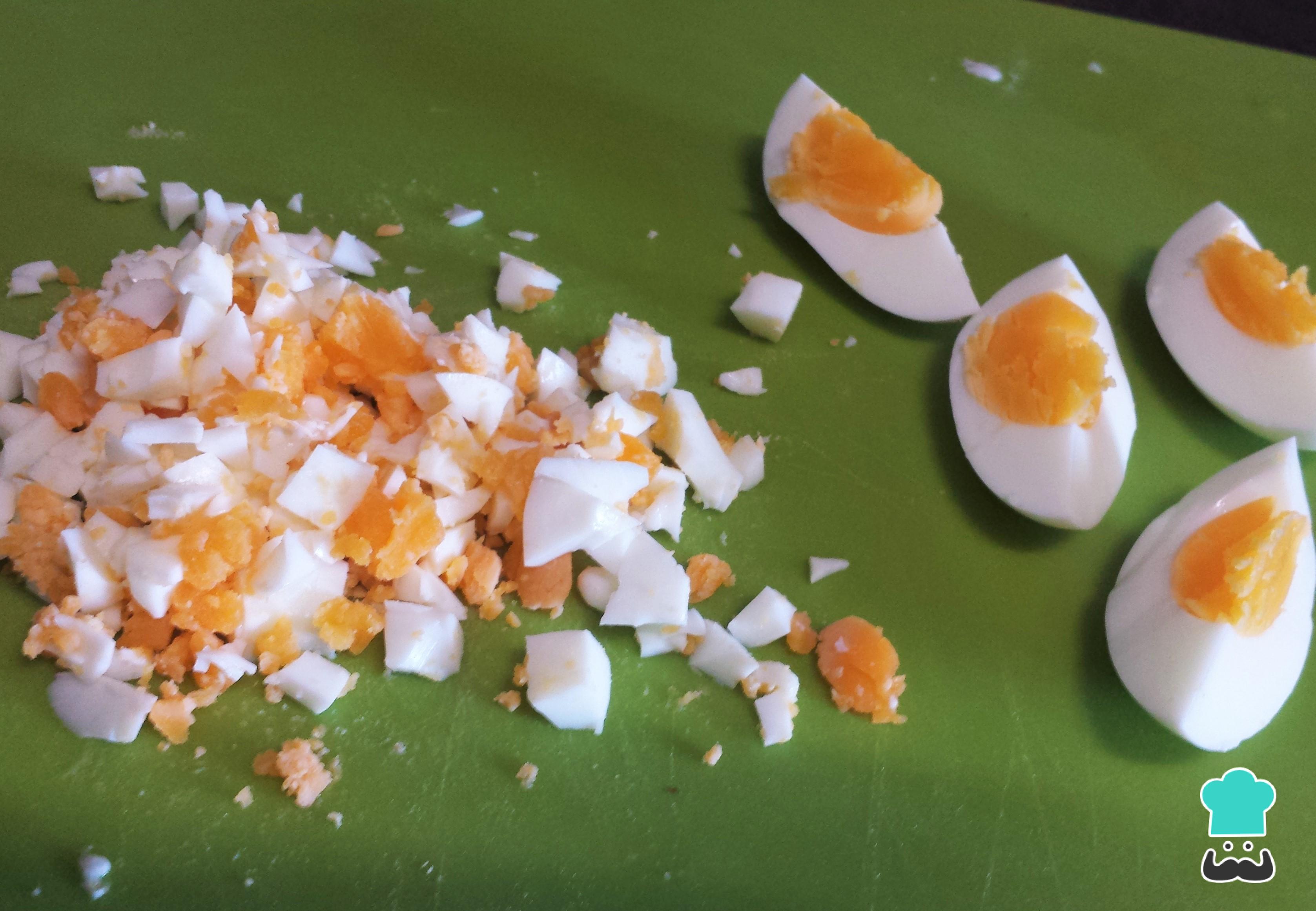 Pica finamente uno de los huevos cocidos. El otro lo puedes picar en trozos para la decoración del plato.
