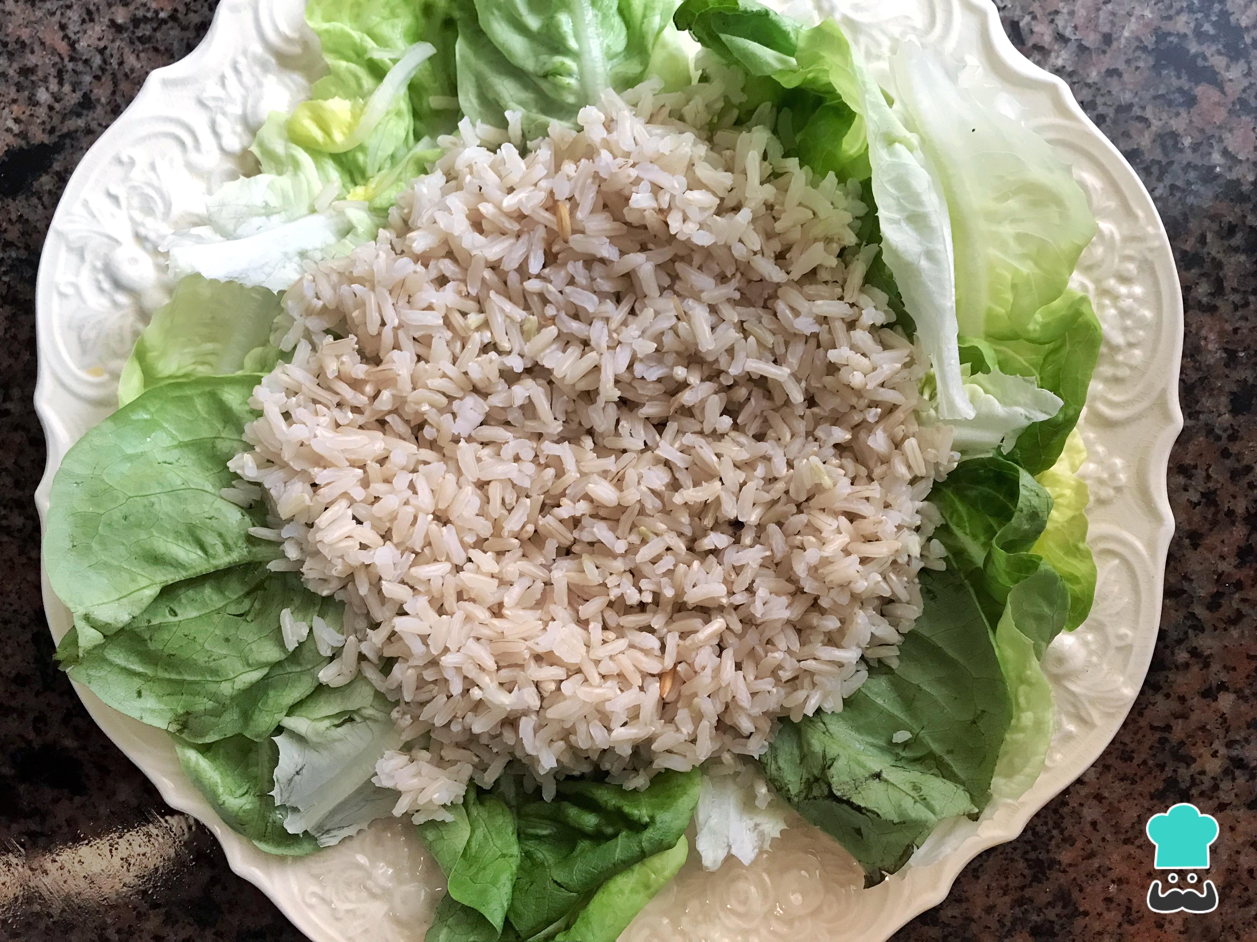 Hierve el arroz en abundante agua por 10-15 minutos, de acuerdo a la indicación del paquete. Enfríalo colándolo con agua fría y disponlo sobre las hojas de la lechuga.