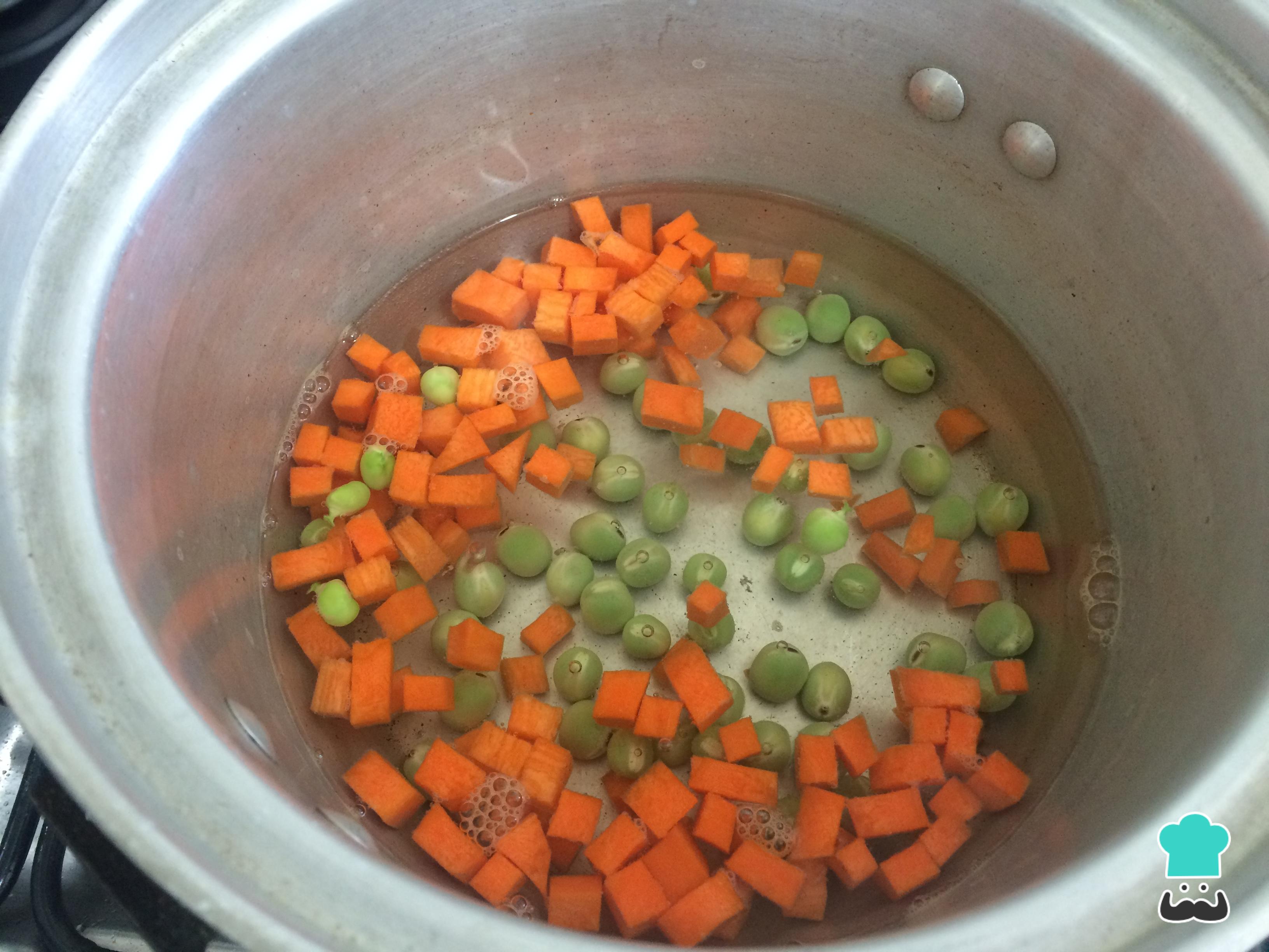 En una olla con agua hirviendo y sal, cocina la zanahoria cortada en cubos pequeños y los guisantes durante 10 minutos. Luego, escúrrelos y resérvalos.