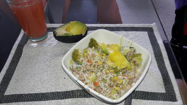 Mezcla muy bien los ingredientes de la ensalada de arroz integral. Observa la fotografía y fíjate en cómo deben distribuirse los alimentos.