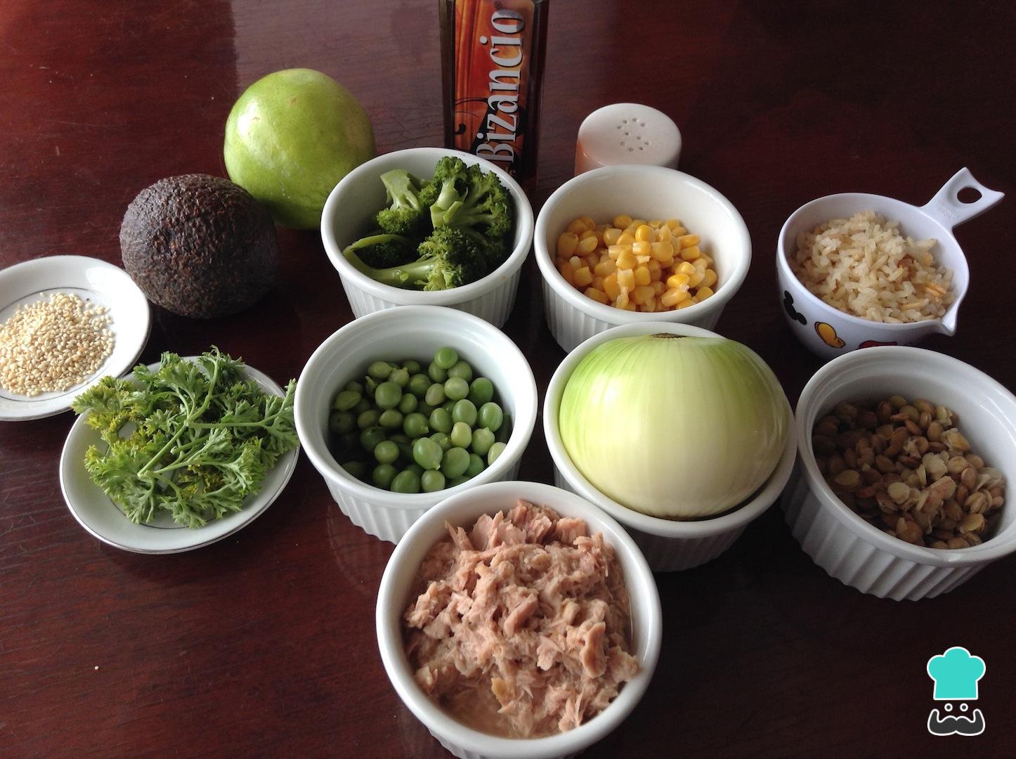 Antes de comenzar a realizar la receta de ensalada de arroz integral y atún debes alistar los ingredientes.