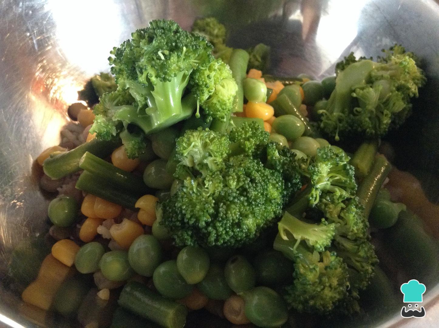 Con la ayuda de un rallador de cocina, ralla la mitad de la cebolla y añádela al tazón donde tenemos el arroz y las lentejas. Luego, agrega el maíz tierno, la arveja y el brócoli. Mezcla bien los ingredientes para seguir con la preparación de la ensalada fresca. Lo ideal es que el brócoli se adicione en ramas pequeñas.
