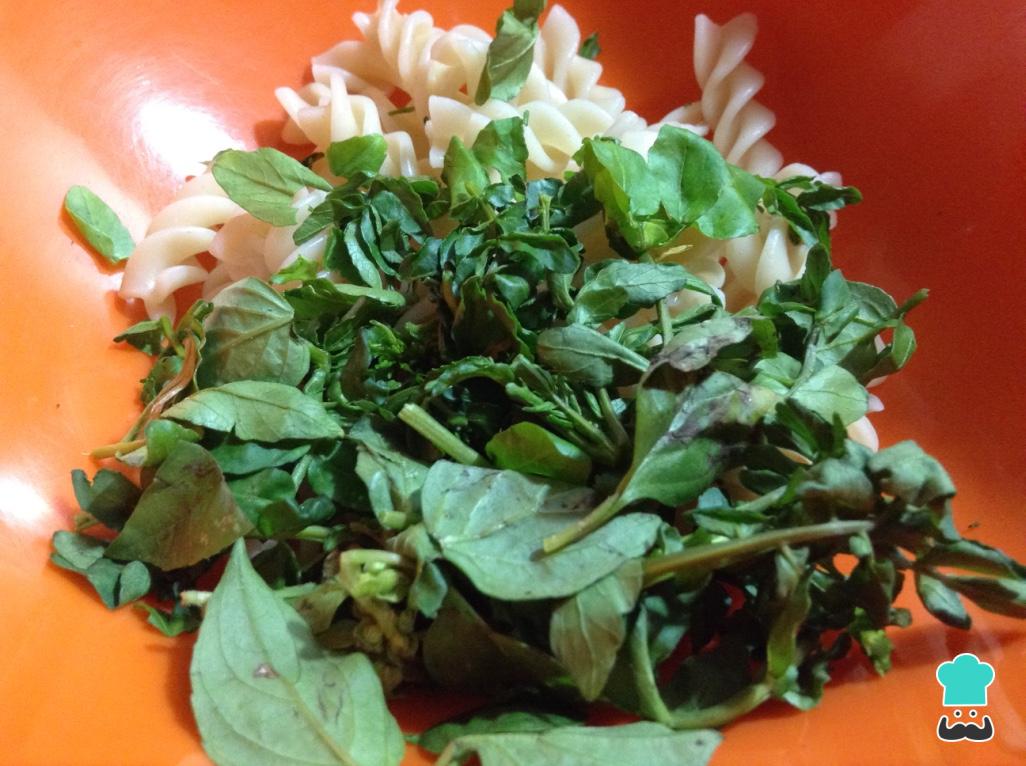 En un tazón hondo añade las hojas de albahaca, los canónigos y los fusilli cocinados. Mezcla bien los ingredientes.
