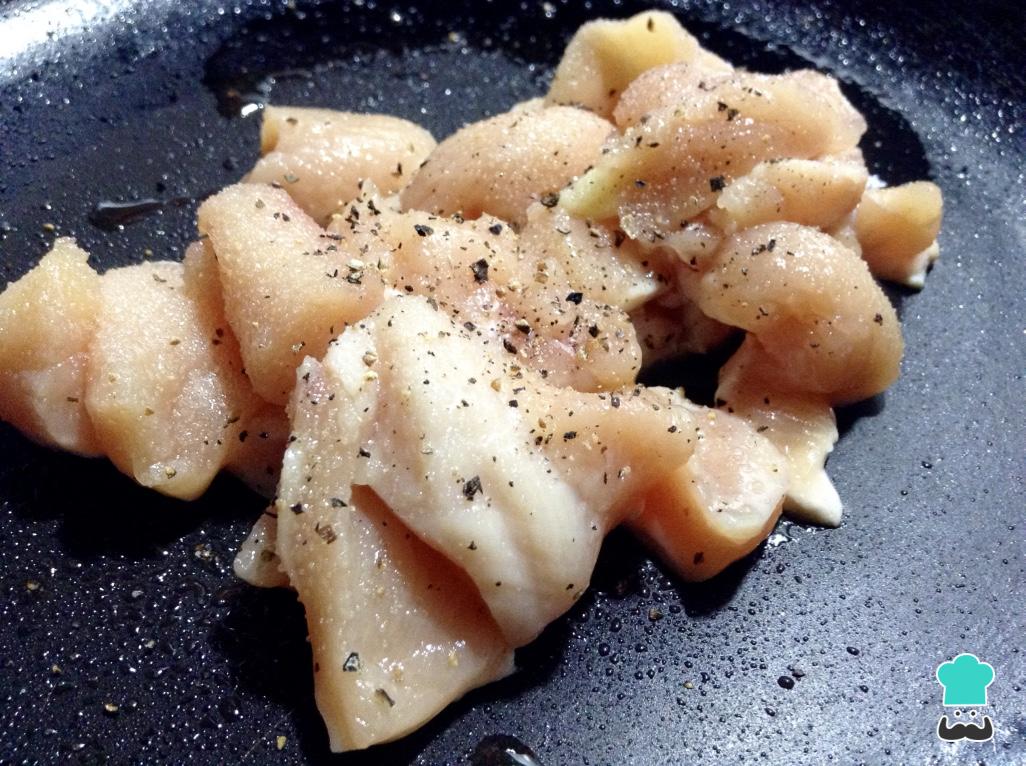 Para cocinar el pollo, lleva una sartén a fuego medio y añade el aceite de oliva. Una vez caliente, agrega la pechuga de pollo cortada en cuadros con sal, pimienta negra y pasta de ajo.
