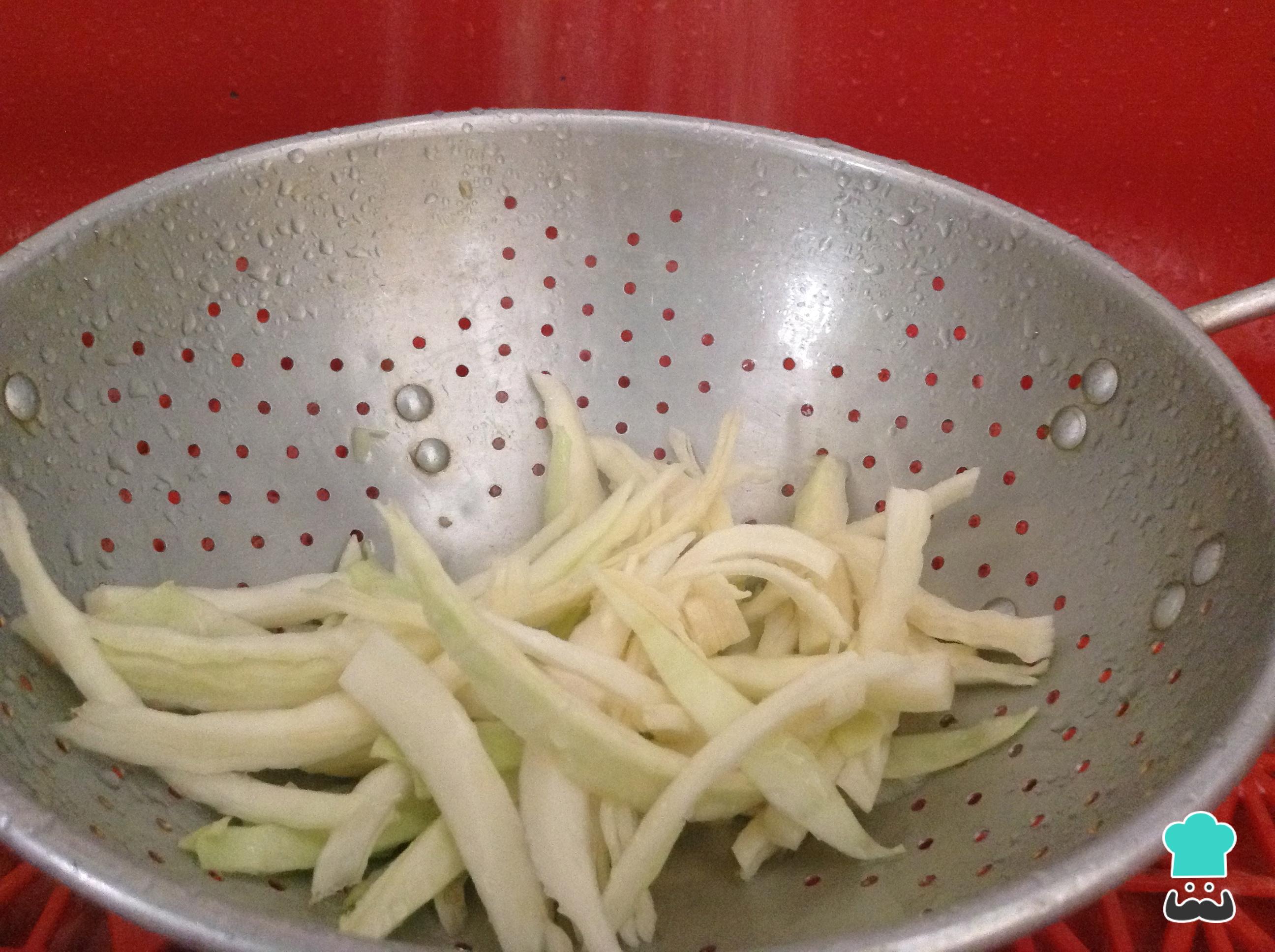 Cortar la col en julianas muy delgadas y lavar bien. Reservar.