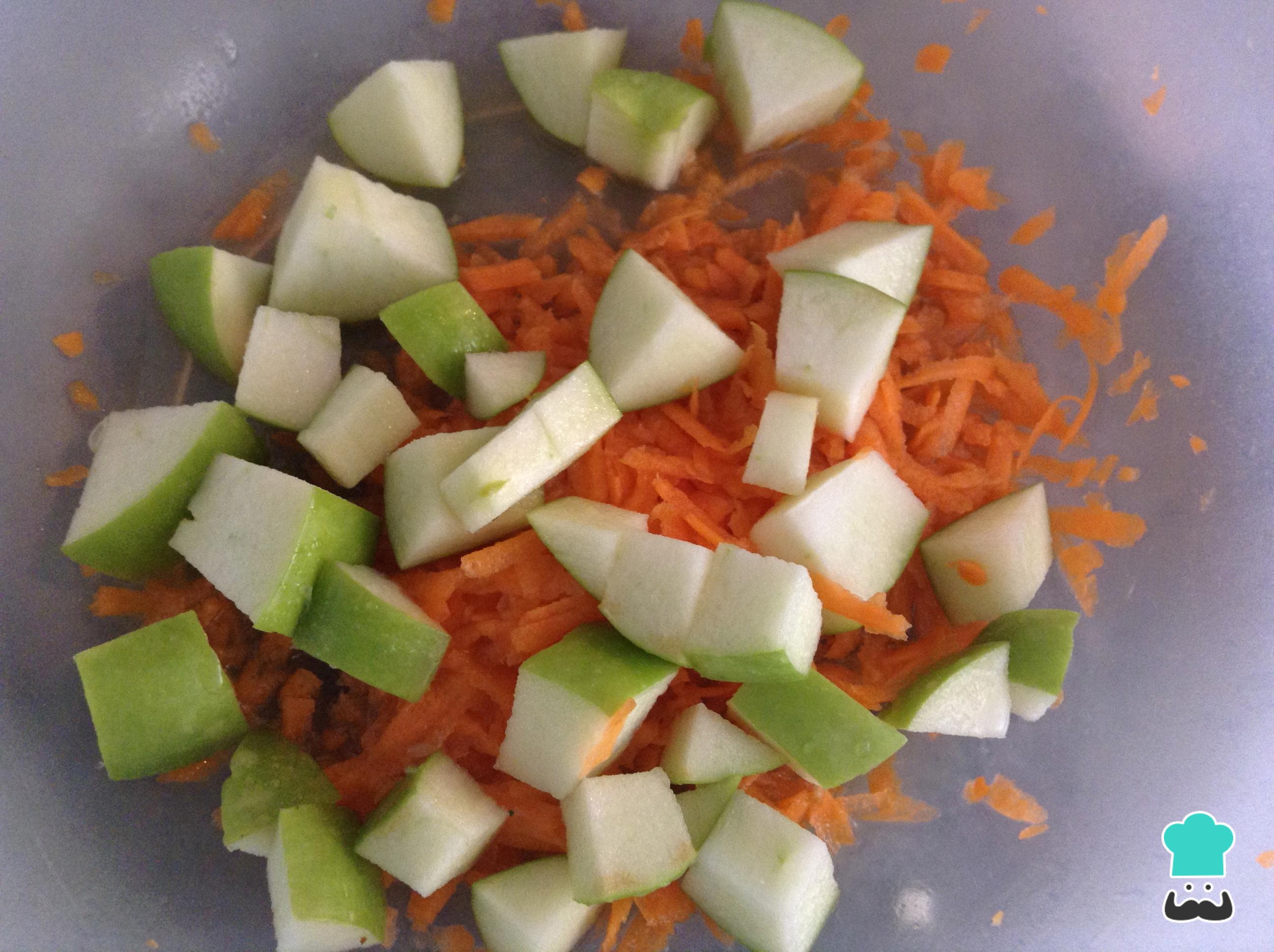 Lavar las manzanas y cortarlas en cuadros medianos.Adicionar el zumo de un limón.Mezclar con la zanahoria.